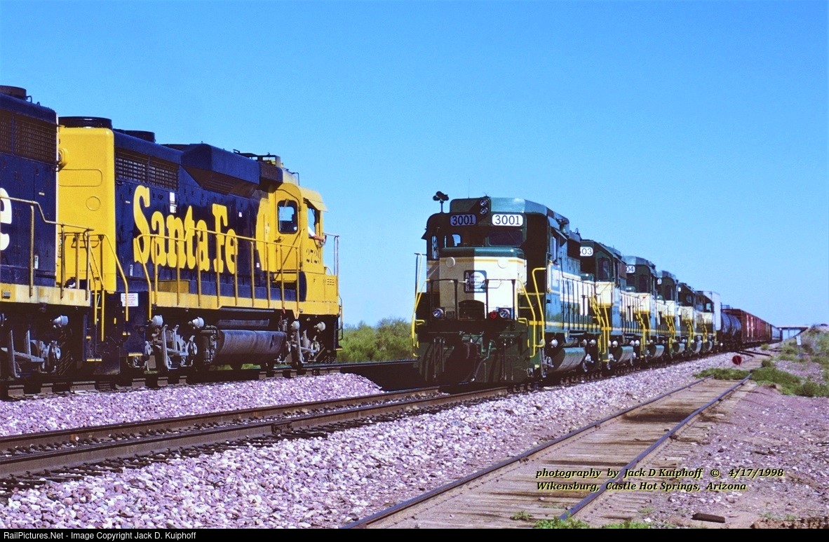 | AT&SF Santa Fe GP30 2729, with train 708e- meets AZCR, Arizona & California GP30 3001, with 707w, at Castle Hot Springs, Wickenburg, Arizona. April 17, 1998. Jack D Kuiphoff © photo |