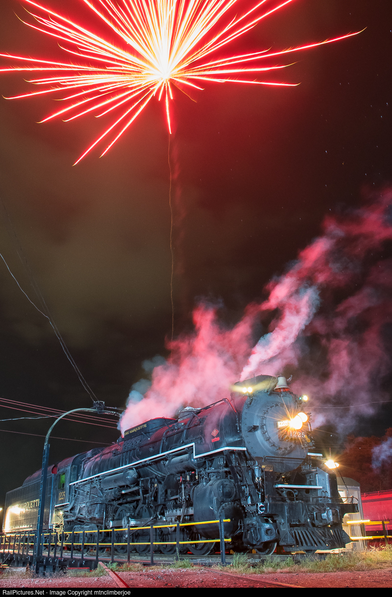 | After a day of testing in preparation for the winter's North Pole Express trains, the Pere Marquette 1225 sits on the turntable at the Steam Railroading Institute in Owosso, Michigan. With the fire slowly burning down and small wisps of steam still coming from the locomotive, a few fireworks in the background make for a festive scene. |