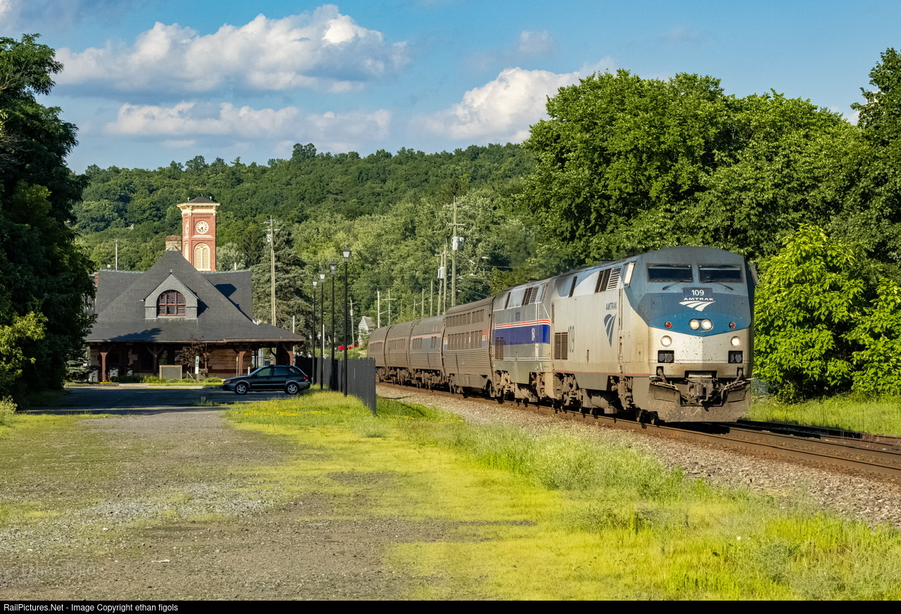 | Amtrak 449 heads west through the Village of Chatham with Amtrak 109 on the point, and Amtrak 164 trailing second. |