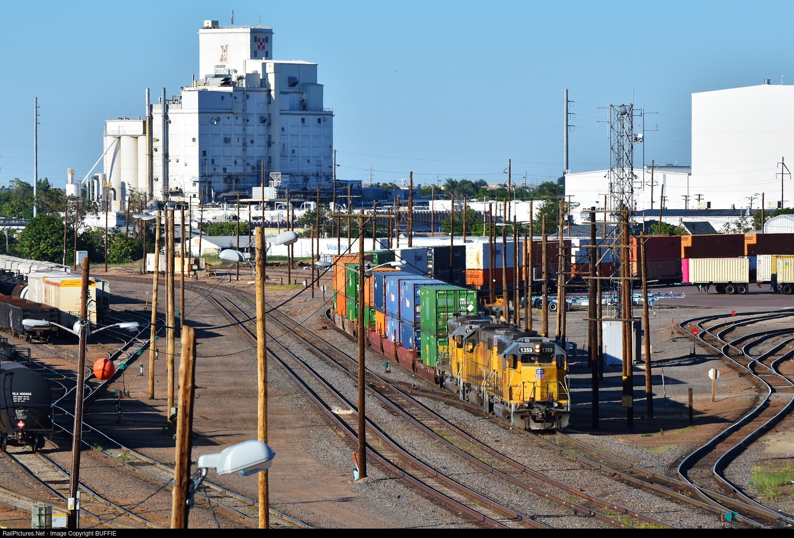 UP 1359 (GP40-2) moves a stack train in the 36th Street Yard in Denver, Colorado.