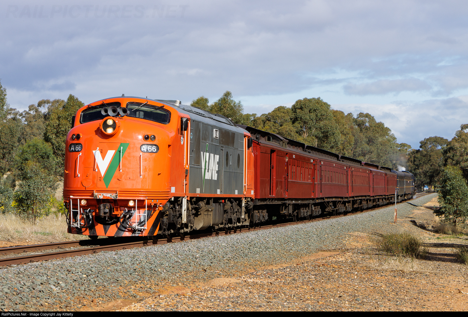V/Line Victoria's A66 is seen working a Steamrail Victoria shuttle from Bendigo near Woodvale