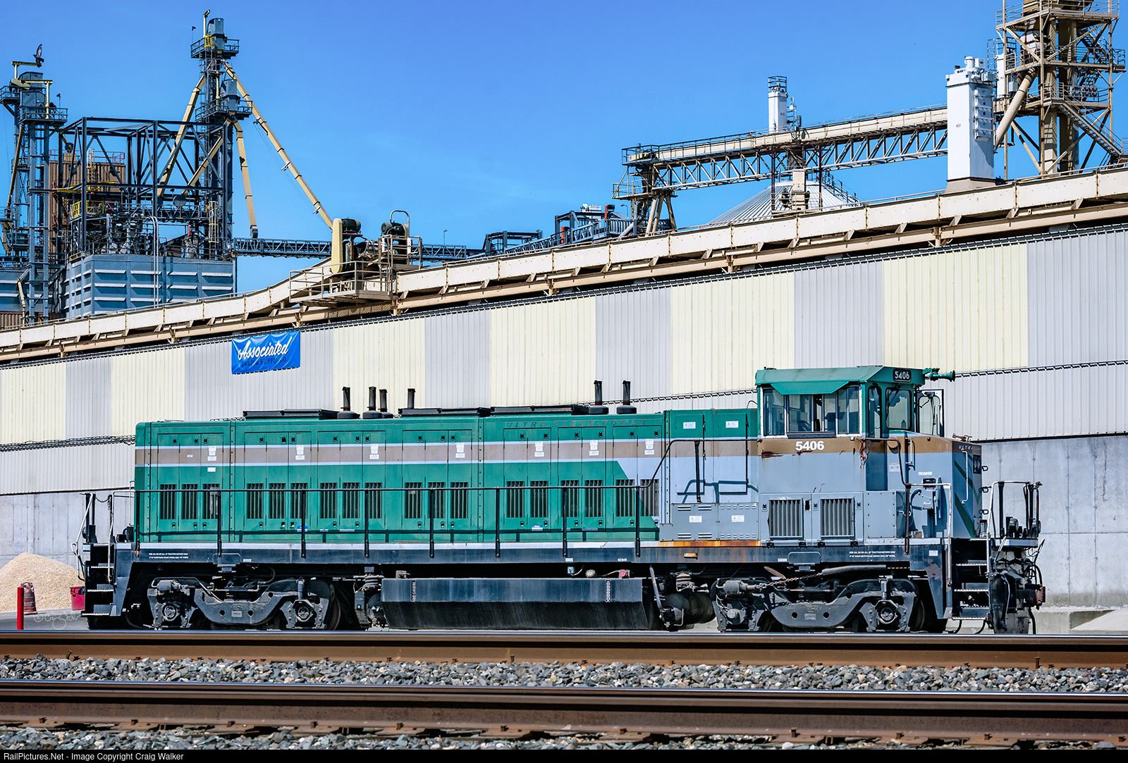 This Railpower Technologies (RPI) RP20BD locomotive, numbered 5406, carries no visible reporting mark, so conventional wisdom has it as a Foster Farms (FPFX) unit. Then again, it could also be owned by Associated Feed & Supply Company, who banner hangs on the shed behind it, but reportedly it is owned by FPFX. This locomotive was built by General Electric as Conrail B36-7 5021 in December 1983. It later became Norfolk Southern B36-7 3609 on June 1, 1999. Railpower eventually acquired it and in January 2007 it was rebuilt into RPRX RP20BD 5409. Click HERE to see this locomotive seventeen years earlier, in 2007, on the BNSF Railway in Fresno. (Traver, California – June 16, 2024)