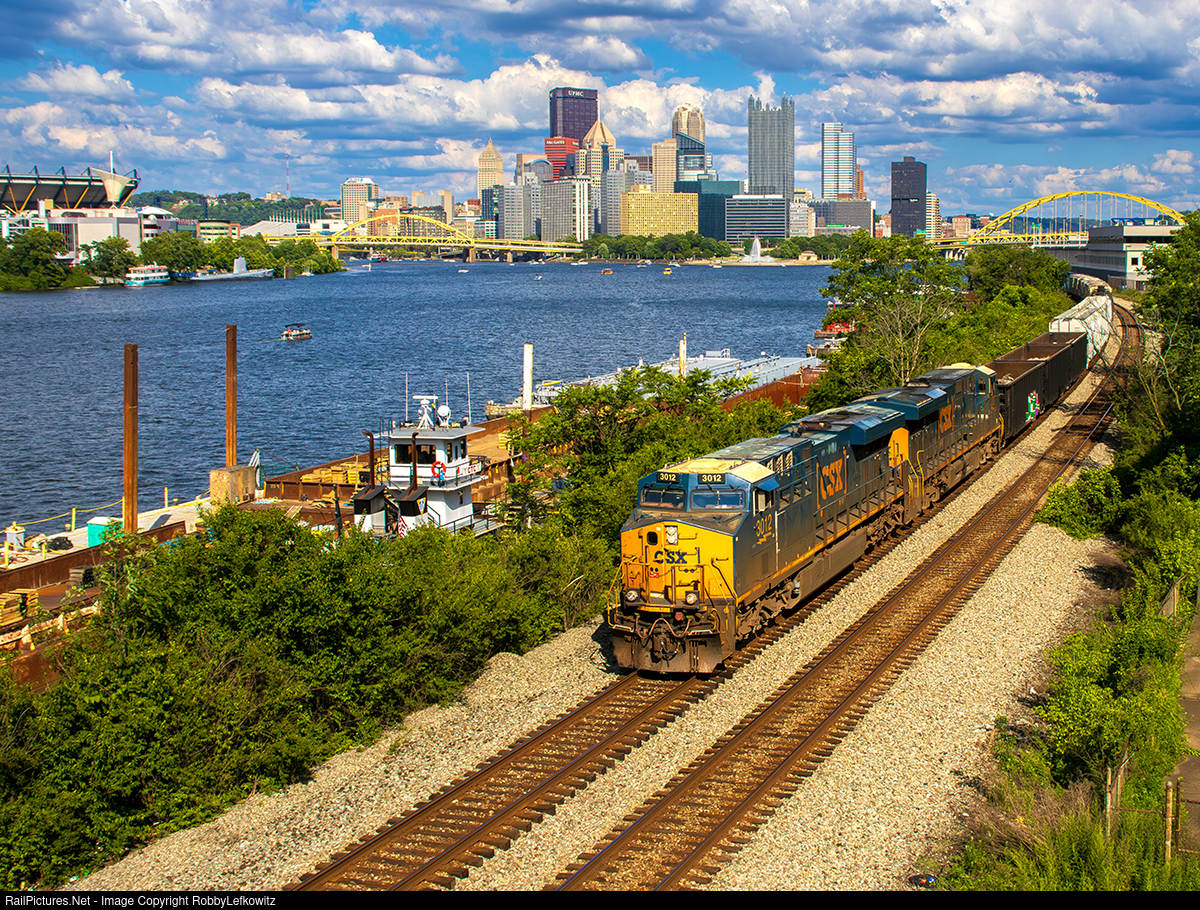 CSXT 3012 brings Pittsburgh Subdivision local CSX L164 westbound through the West End of Pittsburgh, Pennsylvania, as it leaves the city's skyline in the background. |