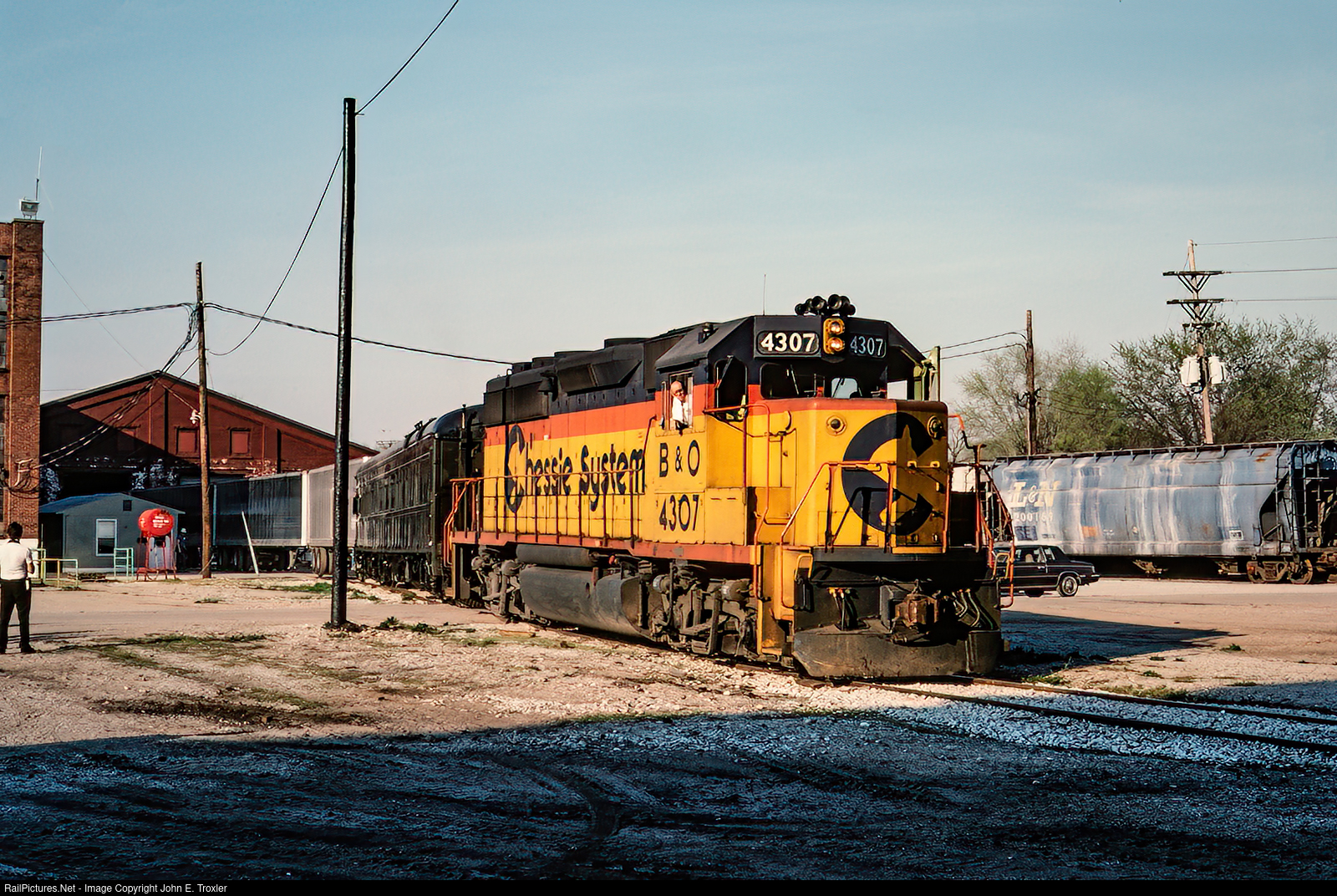 A CSX Roadrailer train fresh from Wabash National's factory location in Lafayette, IN, proceeds south out of CSX’s former Monon shop location in Lafayette. The train will proceed southbound on the former Monon line heading southbound to Atlanta, GA in preparation for the introduction of their inaugural run between Atlanta and Detroit. Kodachrome by Jack Hawkins, John E. Troxler collection.