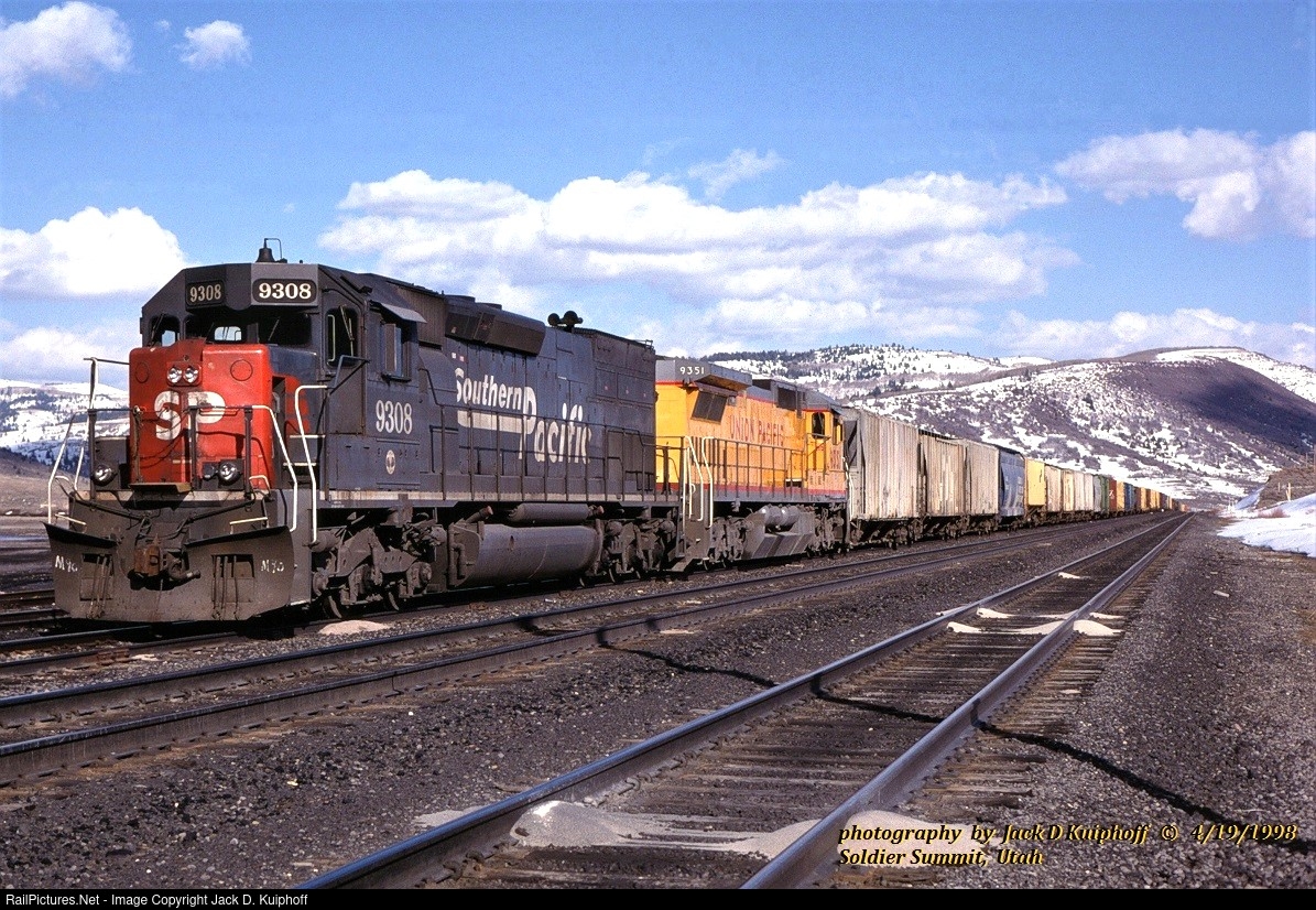 | SP, Southern Pacific 9308-UP 9351 with a westbound at Soldier Summit, Utah. April 19, 1998. Jack D Kuiphoff © photo |