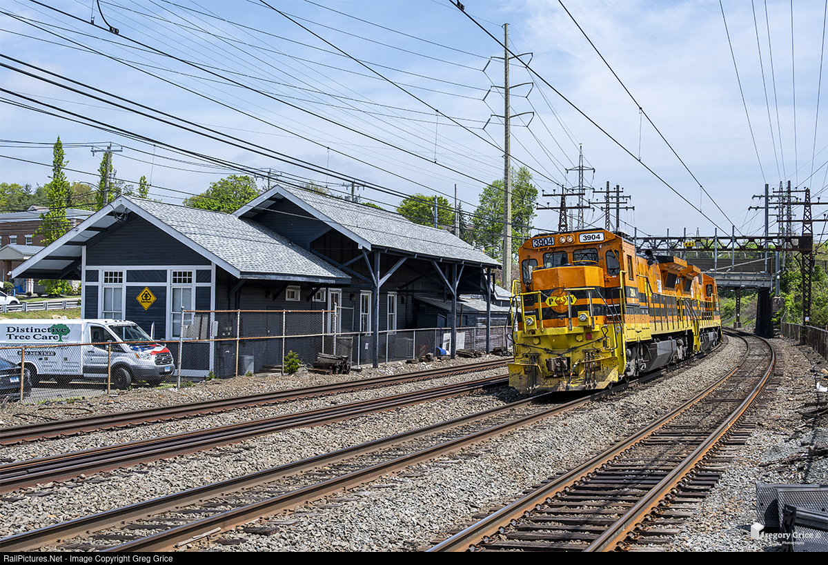 On the morning of May 5, 2024, Providence & Worcester's "NH-1" heads west past the old Noroton Heights station depot on Metro North Railroad's New Haven Line in Connecticut with two GE B39-8s. The crew was en route to Stamford to rescue "CHFP", which had suffered an engine fire on one of its locomotives the previous night.