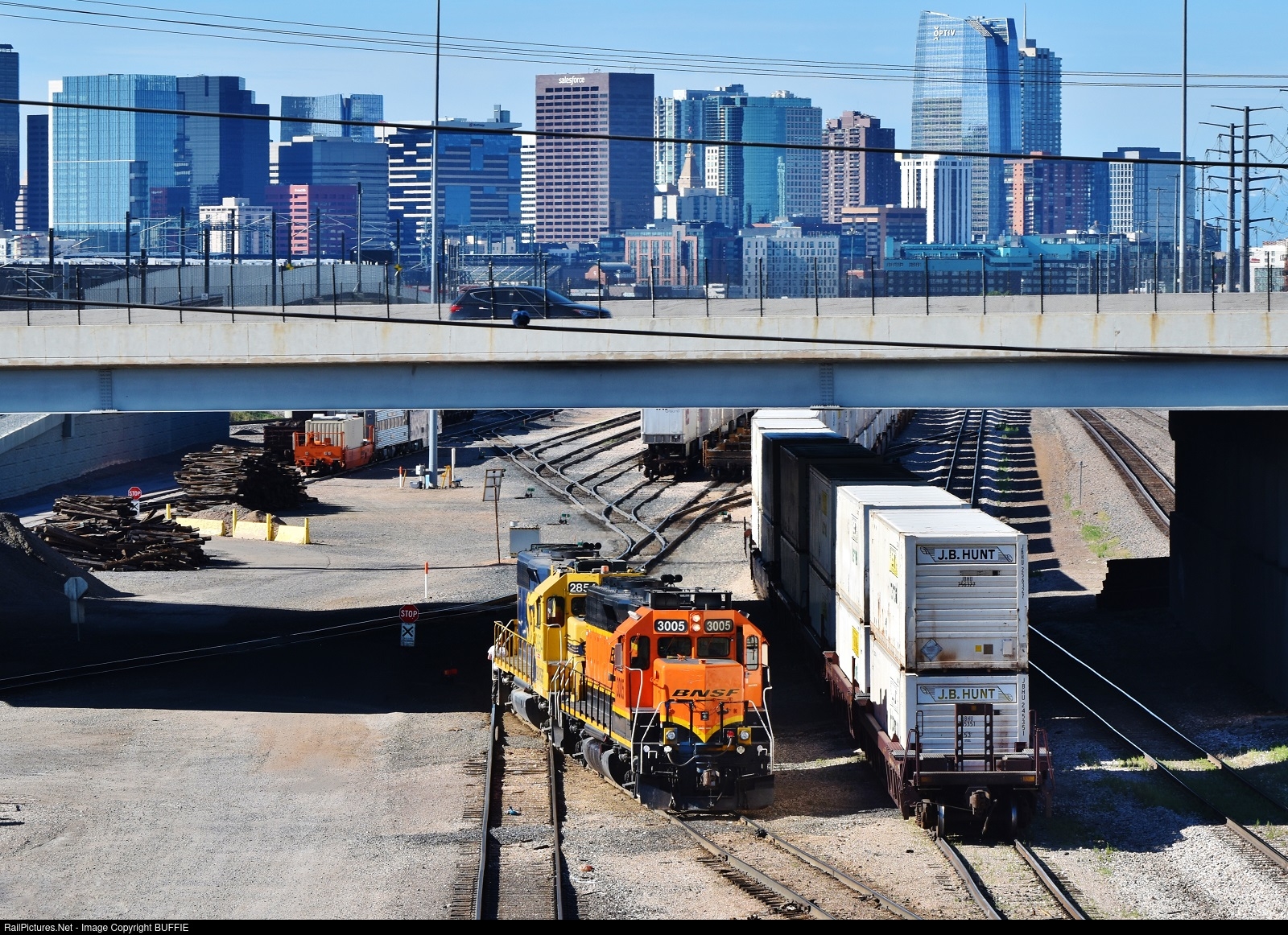 BNSF 3005 (GP40) works the track under Interstate 70 in Denver, Colorado.