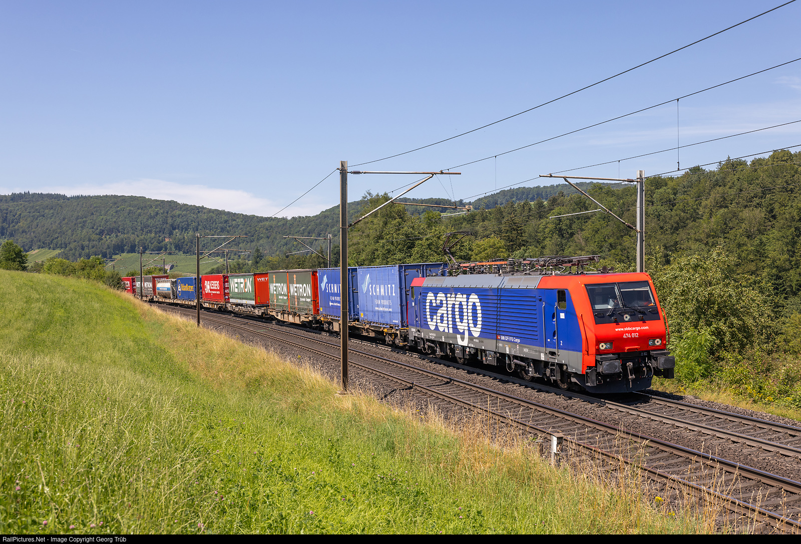 | Siemens ES 64 F4 Re 474 # 012 of SBB Cargo International pulls the southbound intermodal train 40069 from Venlo via Basel-Gotthard Base Tunnel-Luino to Gallarate (Busto Arsizio Terminal) on the Bözberg north ramp between Hornussen and Effingen. |