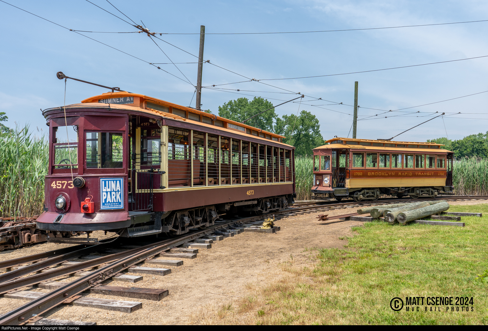 Brooklyn Rapid Transit convertible car no. 4573 (Laconia, 1906) and car no. 1792 (Laclede, 1899) are seen curving around the loop at the Shore Line Trolley Museum, returning to the yard after the morning "Museum in Motion" parade.