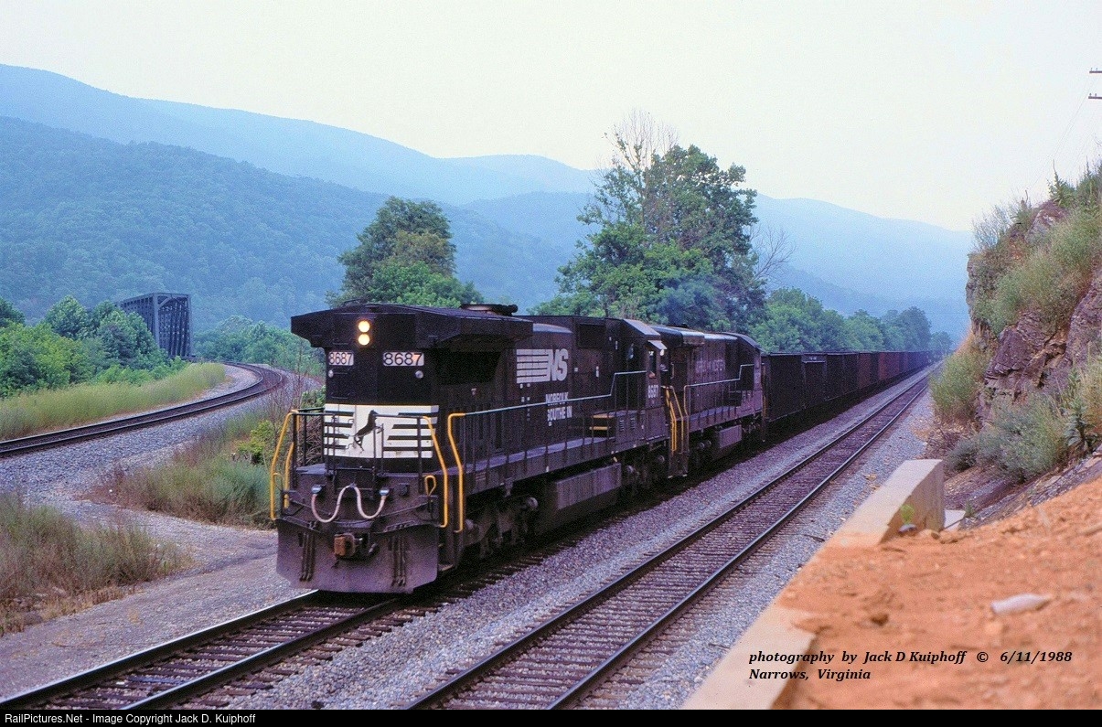 | Norfolk Southern, NS C39-8E 8687 leads as intended, long hood forward a westbound hopper train at, Narrows, Virginia. June 11, 1988. Jack D Kuiphoff photo © |
