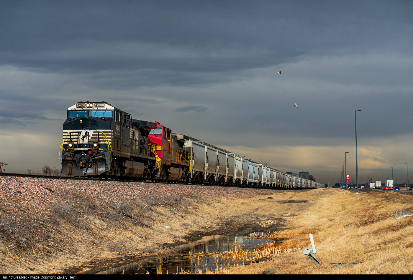 | Dark skies and a building storm provide the backdrop for this Eola, IL to Fort Collins, CO frac sand train paralleling its way down Colorado State Highway 2 as it approaches a red signal for an oncoming train. An eclectic mix of power head this train in the form of an NS AC44C6M and a silver and red BNSF C44-9W |