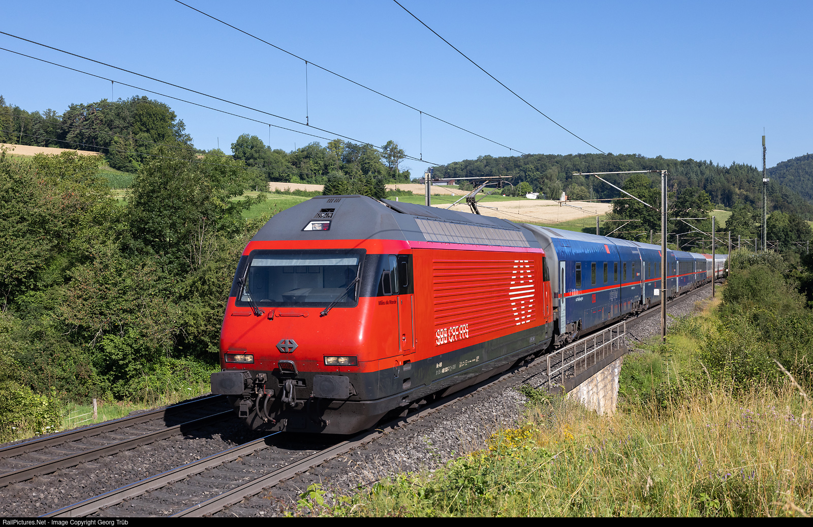 | Re 460 # 003 of the SBB pulls the NightJet NJ 471 from Hamburg Altona via Basel to Zürich on the Bözberg north ramp between Hornussen and Effingen. |