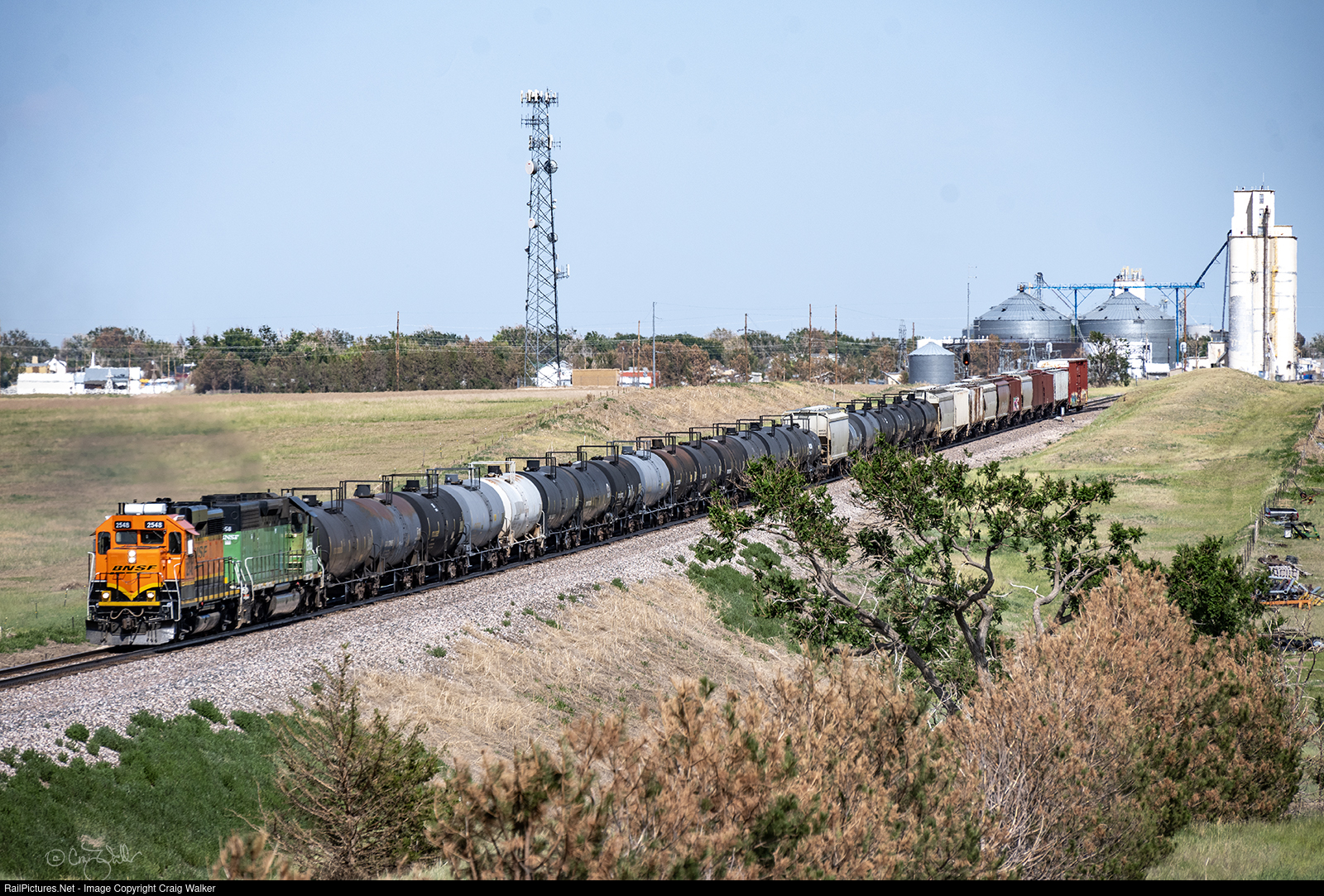 After setting out a string of tank cars in the town of Yuma, BNSF local L-PWR6131-11I continues its westward journey with 33 cars behind "GP39-3" 2548 (built by General Motors Electro-Motive Division in March 1963 as Atchison Topeka & Santa Fe GP30 1221, which was later renumbered ATSF 3221 and, later still, to ATSF 2721, later gaining a new identity through the merger with the BN as Burlington Northern Santa Fe 2431 and, after receiving a new cab, BNSF 2548) and SD40-2 1958 (also build by EMD, but in March 1972 as Colorado & Southern 903, which parent Burlington Northern later renumbered BN 6351, and later became BNSF 6377 thanks to the previously mentioned merger). This is the third old GP30 spotted this day – an improvement over the seemingly endless parade to GE GEVOs! And with temperatures in the high 90ºs this day, I am sure the crew has the 2548's air conditioners cranked up! (Yuma, Colorado – July 11, 2024)
