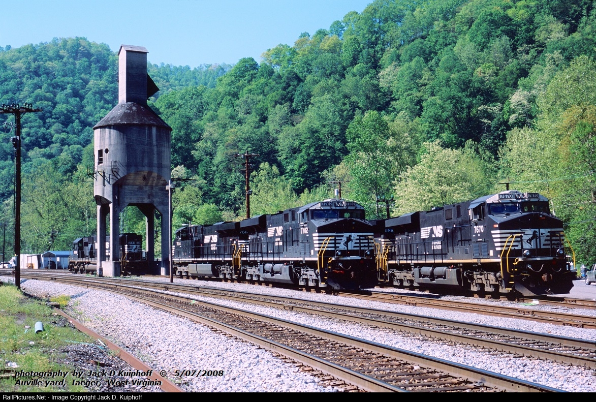 | Norfolk Southern, NS, ES40DC 7702, 7670, at Auville yard, Iaeger, West Virginia. May 7, 2008. Jack D Kuiphoff © photo |