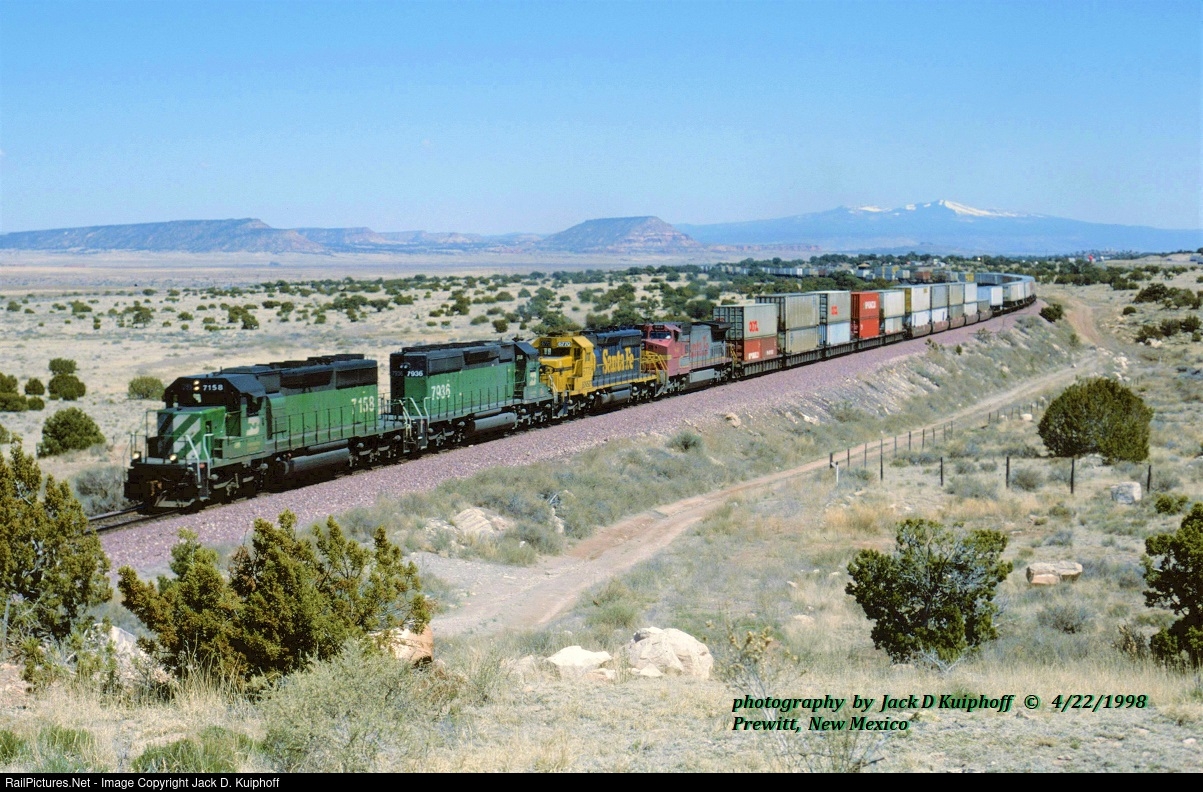 | BNSF, Burlington Northern BN 7158 -7936 -6770 -849 westbound on the Santa Fe's Gallup Sub at Prewitt, New Mexico. April 22, 1998. Jack D Kuiphoff © photo |