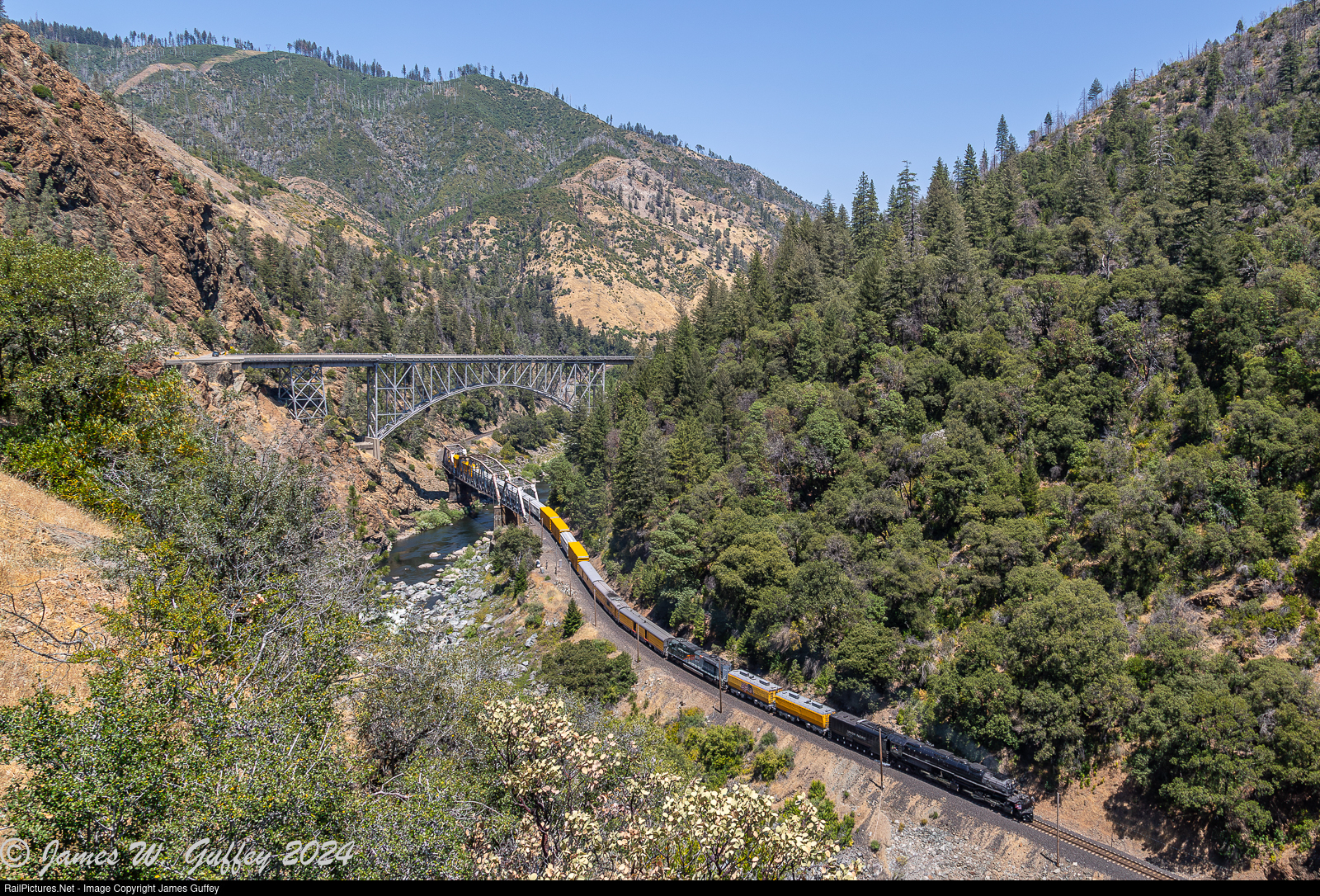 | 4014 rolls westward on the Westward Bound Tour, crossing the the North Fork of the Feather River and passing under the arch bridge carrying California Route 70. The CA-70 bridge was opened in 1932 and is 170 feet above the rail and 200 feet above the water. |