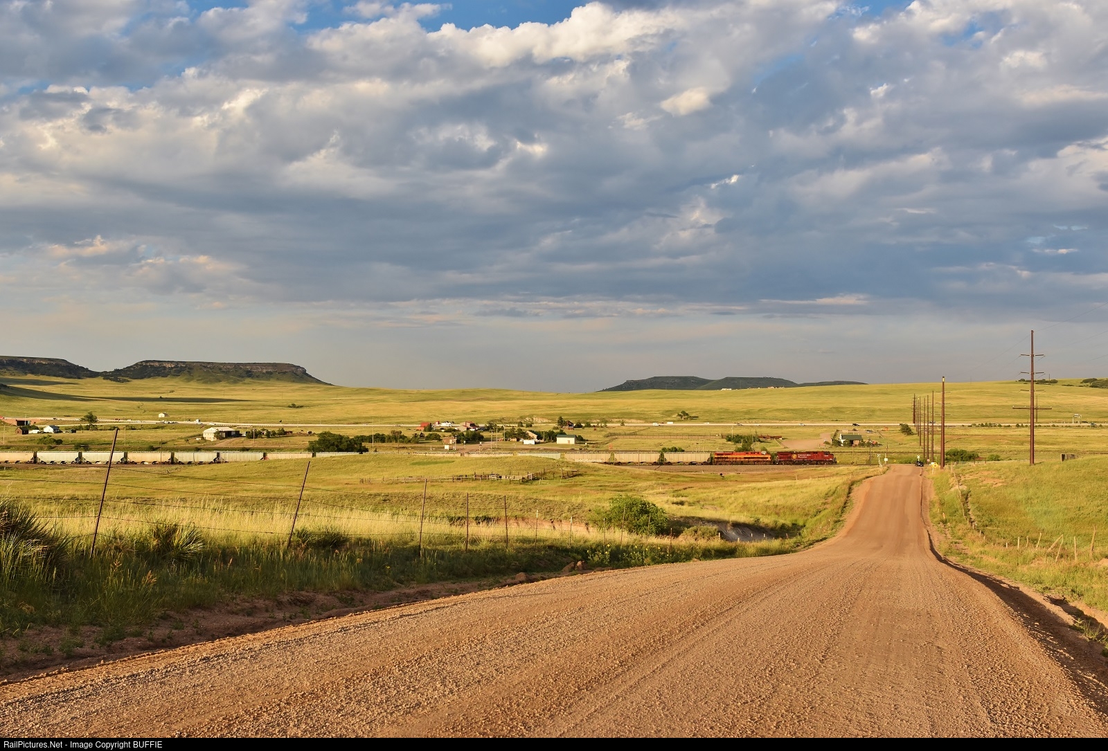 Canadian Pacific #9836 (AC4400CW) runs through the open lands of Greenland, Colorado, crossing over the county road as it heads southbound on the Joint Line.