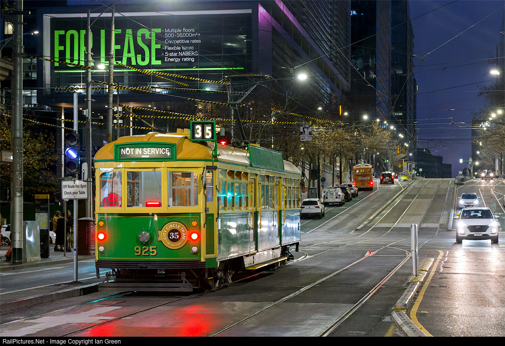 Running via Collins Street instead of the more usual La Trobe Street, City Circle tram W8 925 prepares to turn left into Spencer Street and return to Southbank depot.
