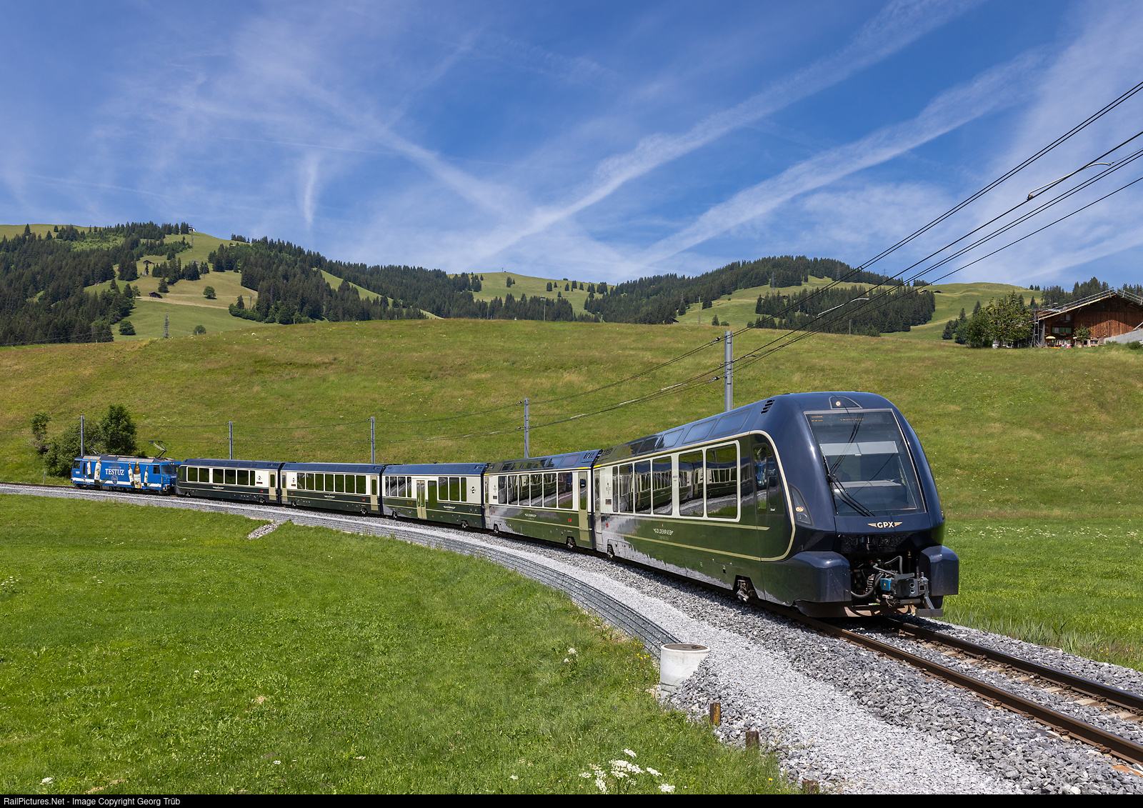Golden Pass Express (GPX) 4069 from Interlaken Ost via Spiez-Zweisimmen-Gstaad to Montreux near Schönried. The gauge change train for standard and meter gauge is on the MOB line on meter gauge between Schönried and Gstaad, with locomotive Ge 4/4 # 8001 in the "Testuz" (winery in the Lavaux region) publicity paint scheme pushing in the rear and cab car Ast at the front. The Golden Pass Express (GPX) gauge change trains have now been supplemented with a fifth car of type Bs NF (low-floor) # 271 to # 274 (center of train). Between Zweisimmen and Interlaken Ost and vice versa, the interface coach Bsi # 291 to # 293 is added for connection with the BLS locomotive Re 465.