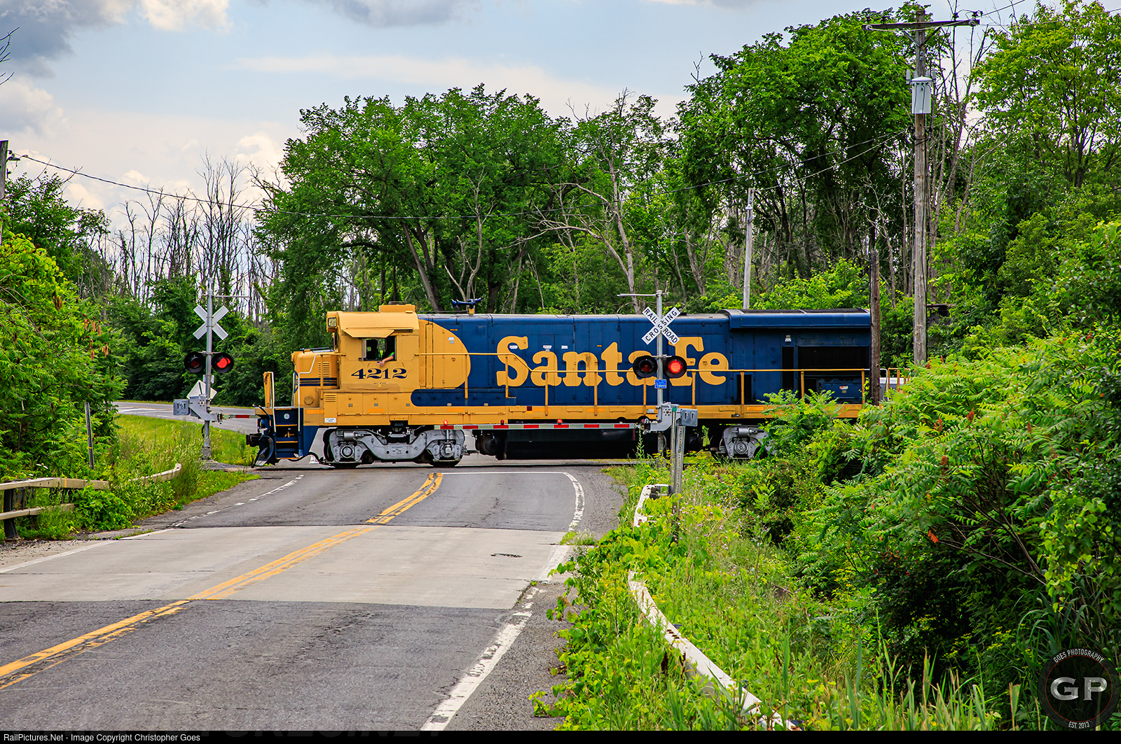 | All down hill from the Albany Main as SMS NE-1 lead by 4212 rolls over the last crossing of their trip, Albany County Route 201 "Depot Rd." re-entering the Industrial Park giving a side view of the Ex. ATSF Blue Bonnet paint scheme. |
