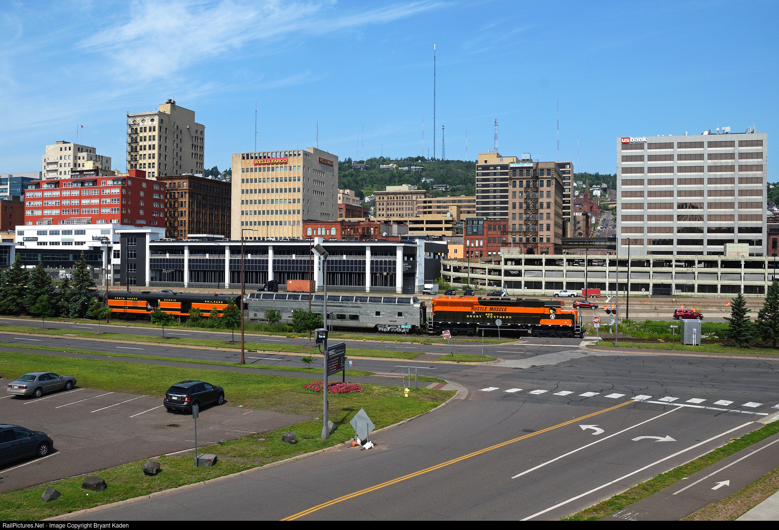| Pulled by GN 400, a North Shore Scenic Railroad excursion train passes downtown Duluth, MN as it departs for points north. |