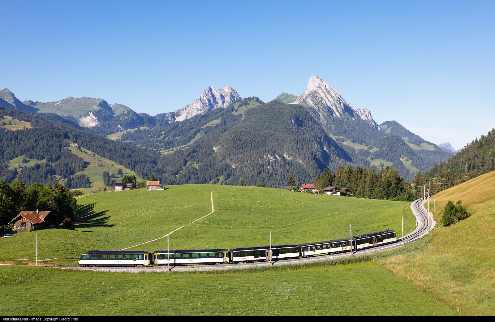 | Regional train 2208 of the line R 30 from Montreux to Zweisimmen between Gruben and Schönried. Pulling is "Alpina" railcar Be 4/4 # 9203 (StadlerRail 1996) and in the rear cab car Ast # 116 (R+J/MOB 1985/1995). This train will run as GOLDEN PASS PANORAMIC in the opposite direction afterwards. The color scheme of the MOB is called nightblue/champagnewhite. In the background Gummfluh and Le Rubli. |