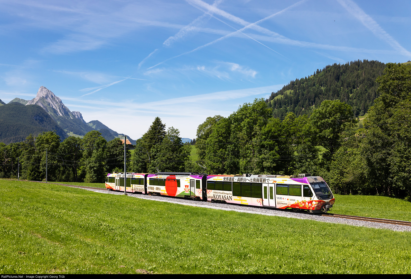 | Push-pull regional train 2417 of the line R32 from Zweisimmen to Gstaad, between Schönried and Gruben, with railcar Be 4/4 # 5002 in the middle and cab cars ABt # 342 and Bt # 242. The train has a publicity paint scheme for the UNESCO World Heritage Koyasan in Japan and for the sister railway Nankai. On the left is Le Rubli mountain. |