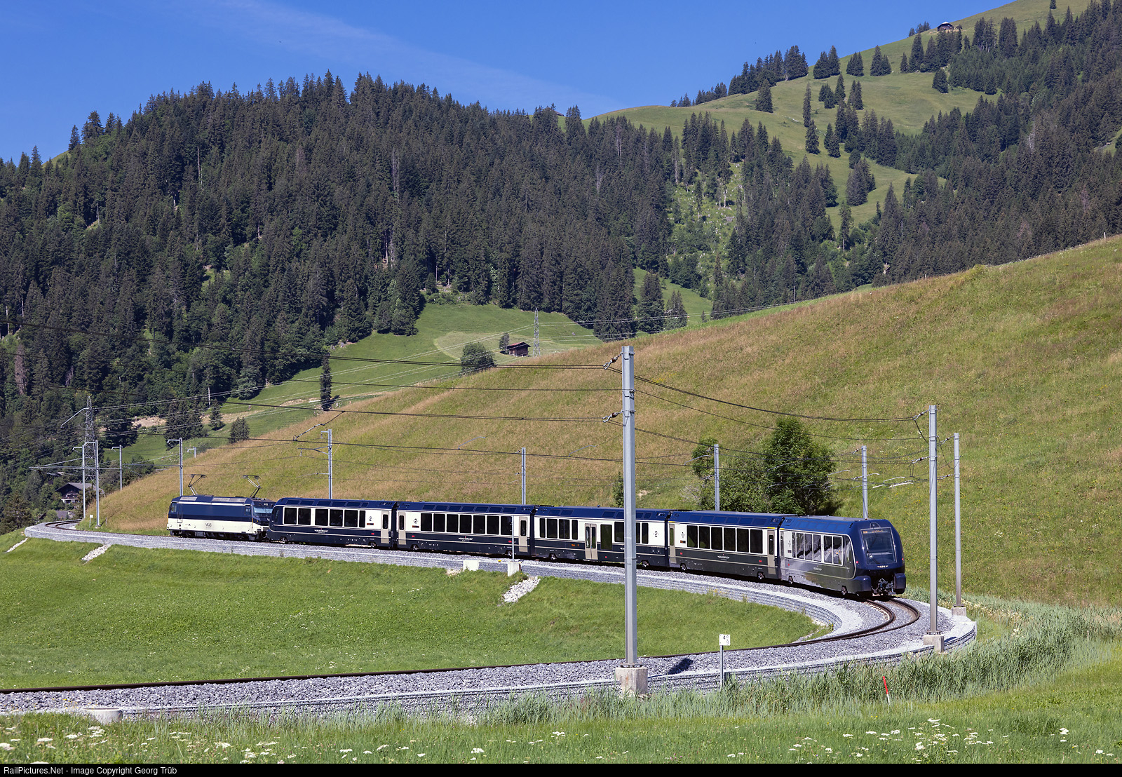 | GOLDEN PASS EXPRESS (GPX) PE 4068 of the line PE30 from Montreux via Zweisimmen to Interlaken Ost, with locomotive Ge 4/4 # 8004 of the Montreux Oberland Bernois (MOB), between Gstaad and Schönried. The cars will change gauge in Zweisimmen from 1 meter gauge to standard gauge, the locomotive will change to Re 465 of the BLS. The Golden Pass Express (GPX) gauge change trains have now been supplemented with a fifth car of type Bs NF (low-floor) # 271 to # 274 (center of train). Between Zweisimmen and Interlaken Ost and vice versa, the interface coach Bsi # 291 to # 293 is added for connection with the BLS locomotive Re 465. |
