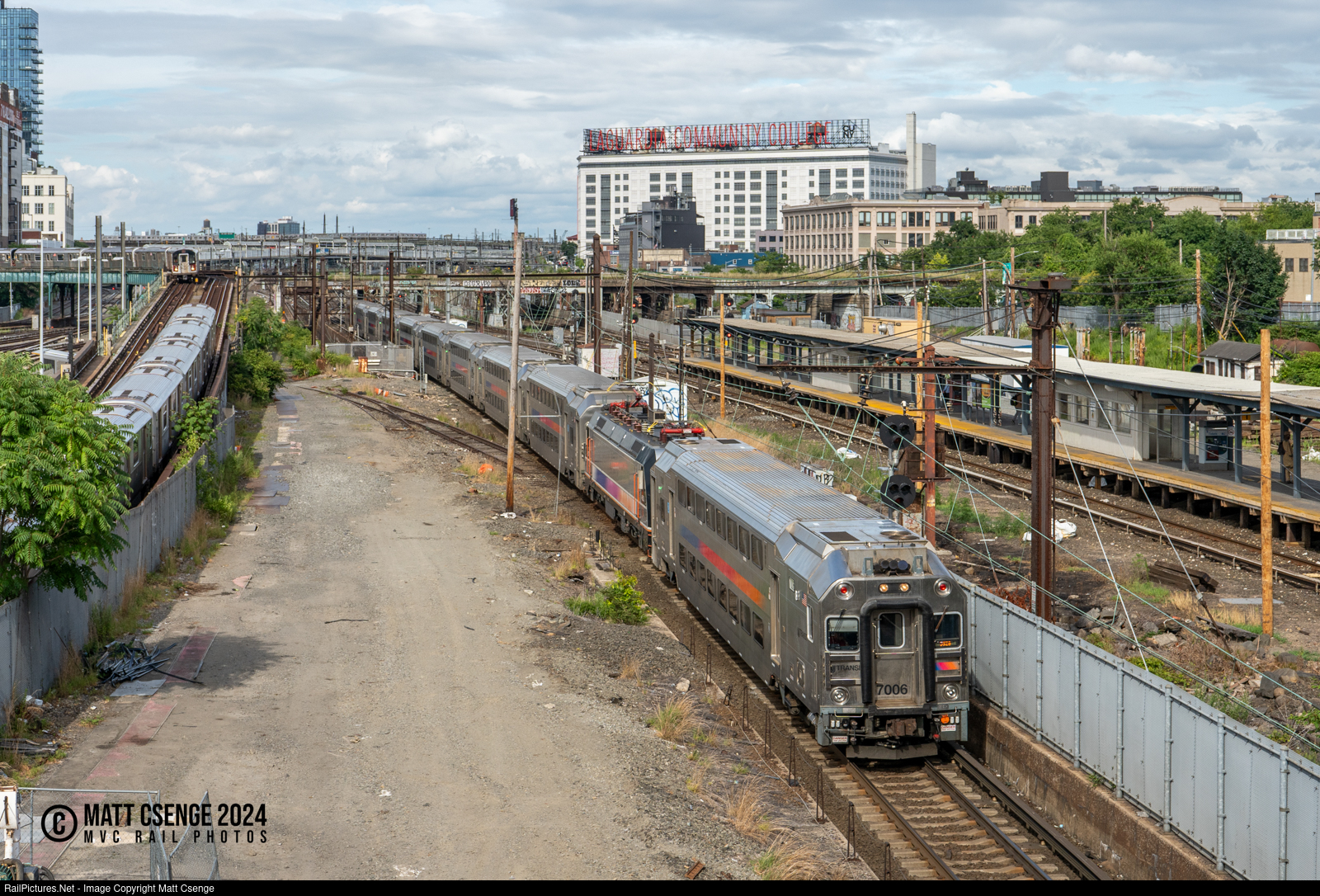 On July 11, 2024, NJ Transit Northeast Corridor Line train 3951 operated with an unusual consist, having MultiLevel cab car 7006 leading ahead of ALP-46A no. 4653. The train is seen here about to enter the East River Tunnels from Queens into New York Penn Station, passing the Long Island Rail Road's Hunterspoint Avenue station at right.