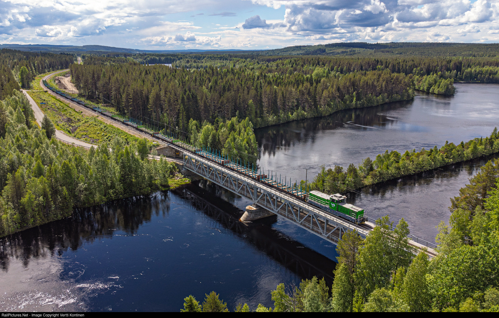 | Dr19 2841 pulling an empty timber train northbound over a combined road and rail bridge providing local road 8891 and Kontiomäki-Pesiökylä line a way over river Emäjoki. The beauty of Kainuu region at it's best! |