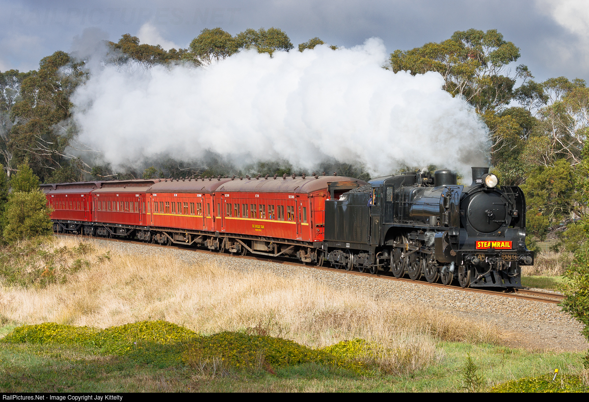 | Steamrail Victoria's A2 986 is seen leading a Ballarat bound steam shuttle through Navigators, in a lucky patch of sun. |