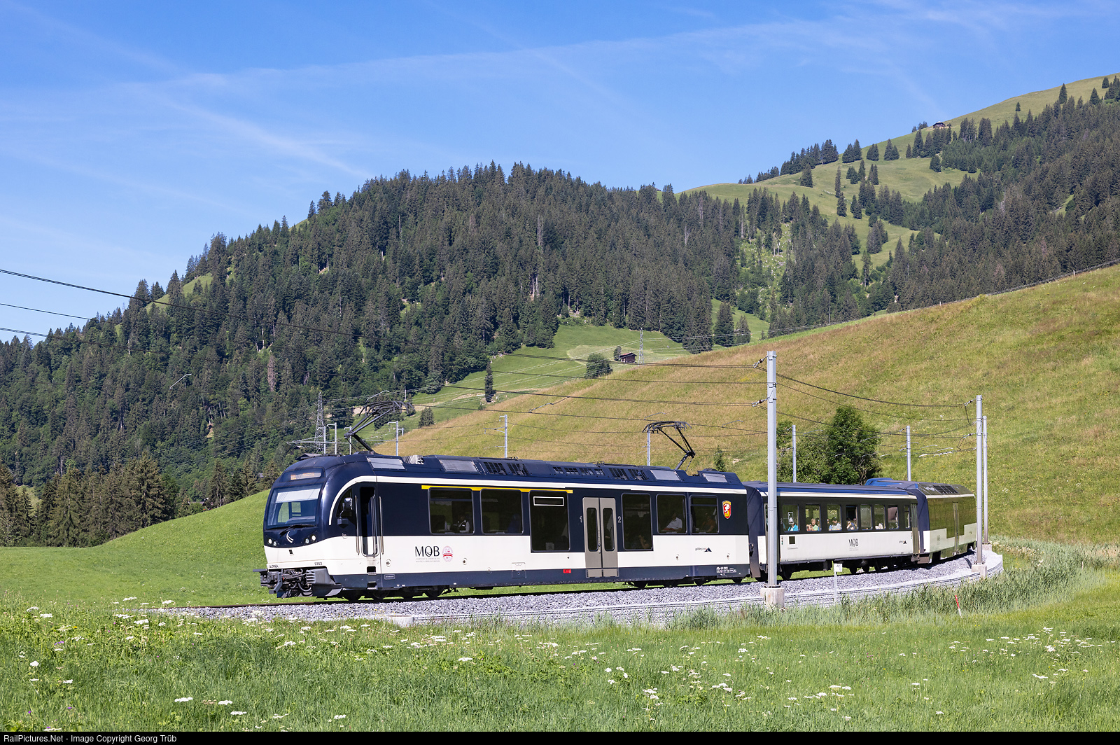 | "Alpina" railcar ABe 4/4 # 9302 (built 2016 by StadlerRail) of the Montreux Oberland Bernois (MOB) is pulling the push-pull train PE 2215 of the line PE30 GOLDENPASS PANORAMIC from Zweisimmen to Montreux, between Schönried and Gruben. In the rear is first class cab car Ast # 152 built by Breda in 1993. The paint scheme of the MOB is called nightblue/champagnewhite. |
