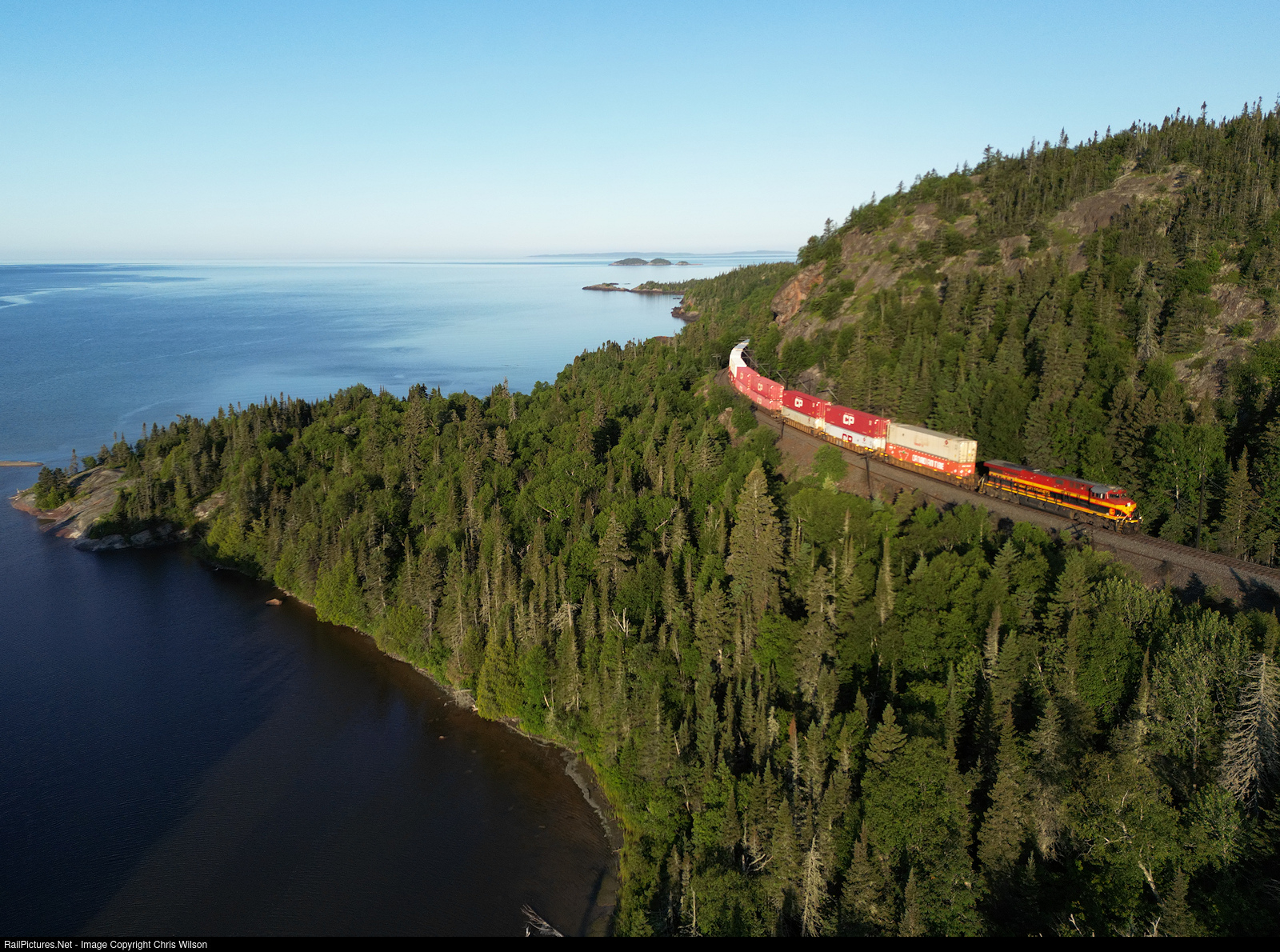 KCSM ES44AC 4748 pulls 118s freight along the shores of Lake Superior at Neys, Ontario