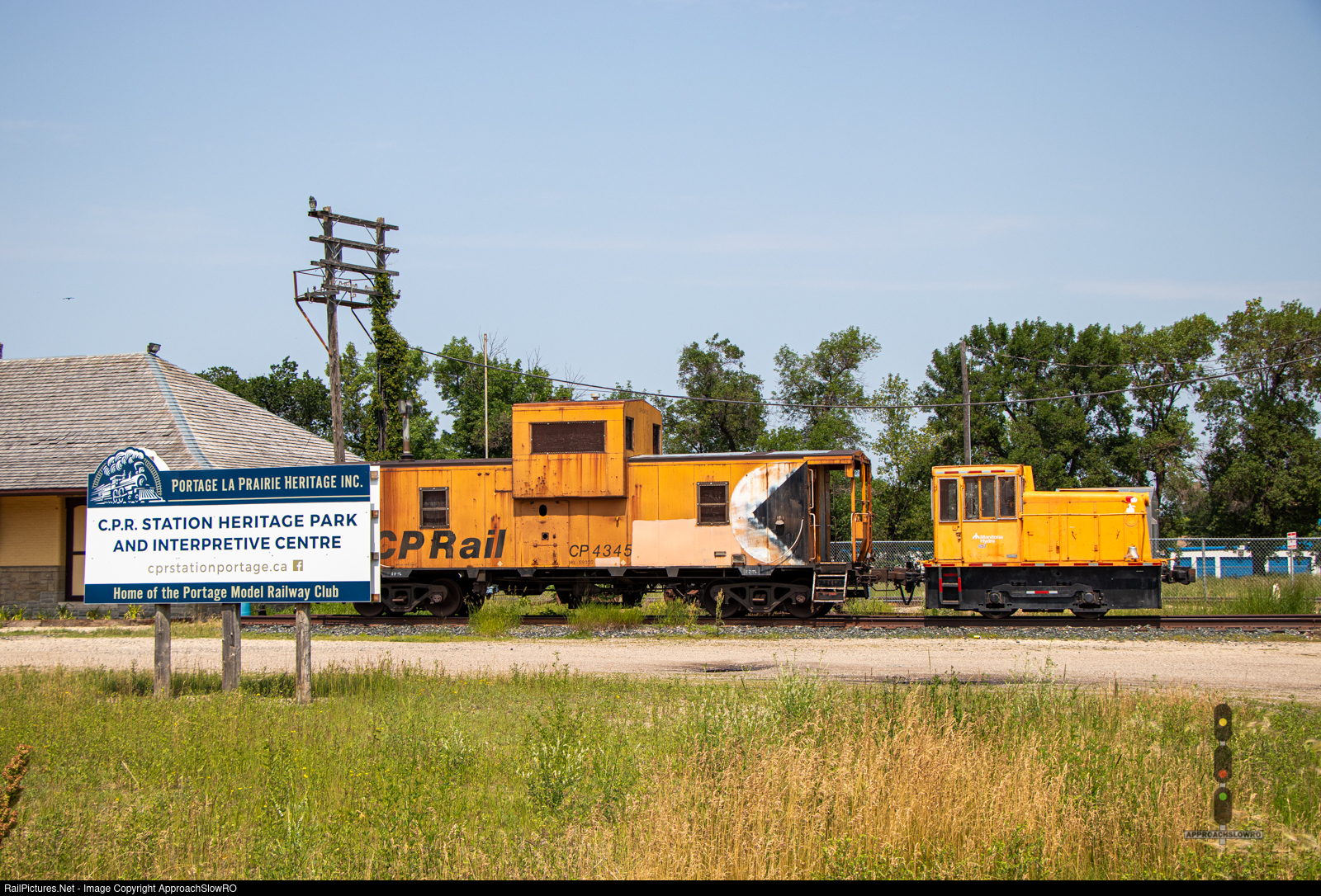 | Former Manitoba Hydro locomotive 857 "Snoopy" sits outside the CP rail station in Portage, coupled up to CP caboose 434560.