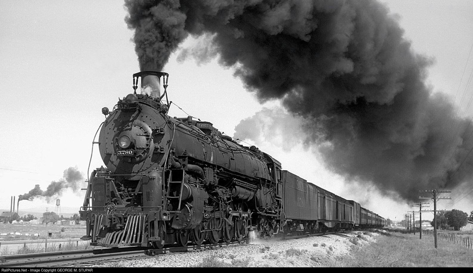 AT&SF 4-8-4 3780 emits an impressive smoke plume as it leads second number 3, The California Limited, at 40 MPH south of Bernalillo New Mexico in 1947. Otto Conrad Perry photo, from my collection.