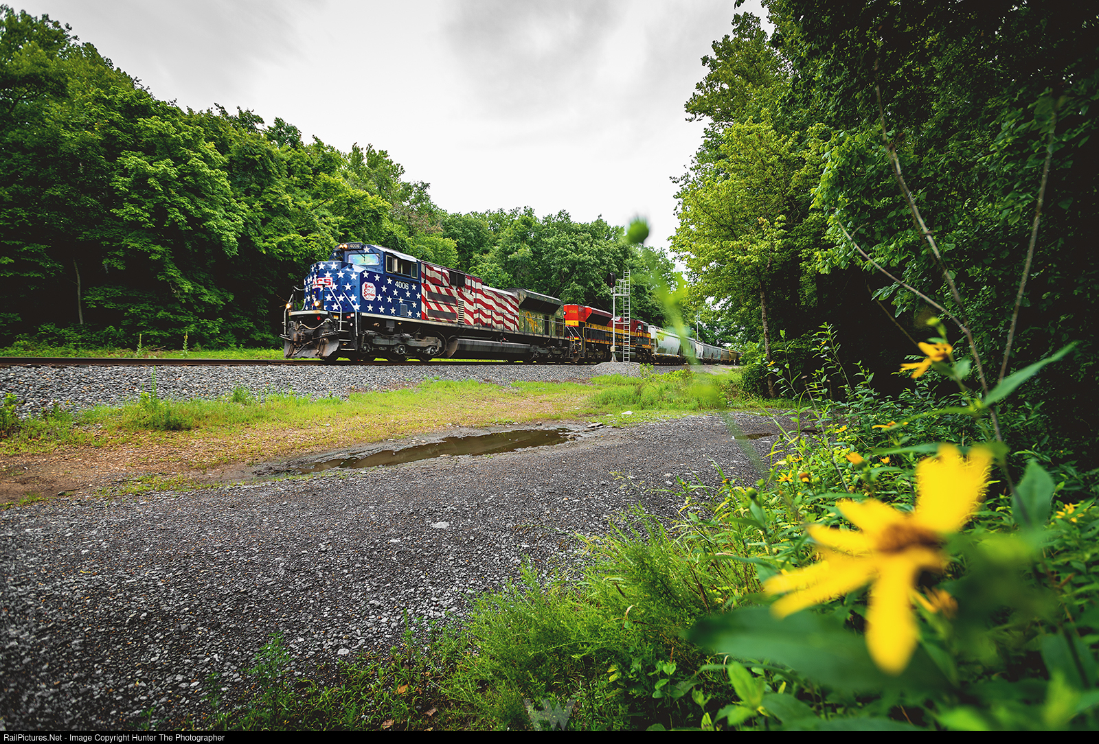 ACes In The Hole | KCS 4006 and 4068 - a pair of EMD SD70ACe engines - enter the siding at Watts, OK with a loaded grain train in tow on a cloudy Wednesday, July 17, 2024. 4006 is the specially-painted "Salute to Veterans" unit, which nicely complements the colorful flora of the woods in eastern Oklahoma.