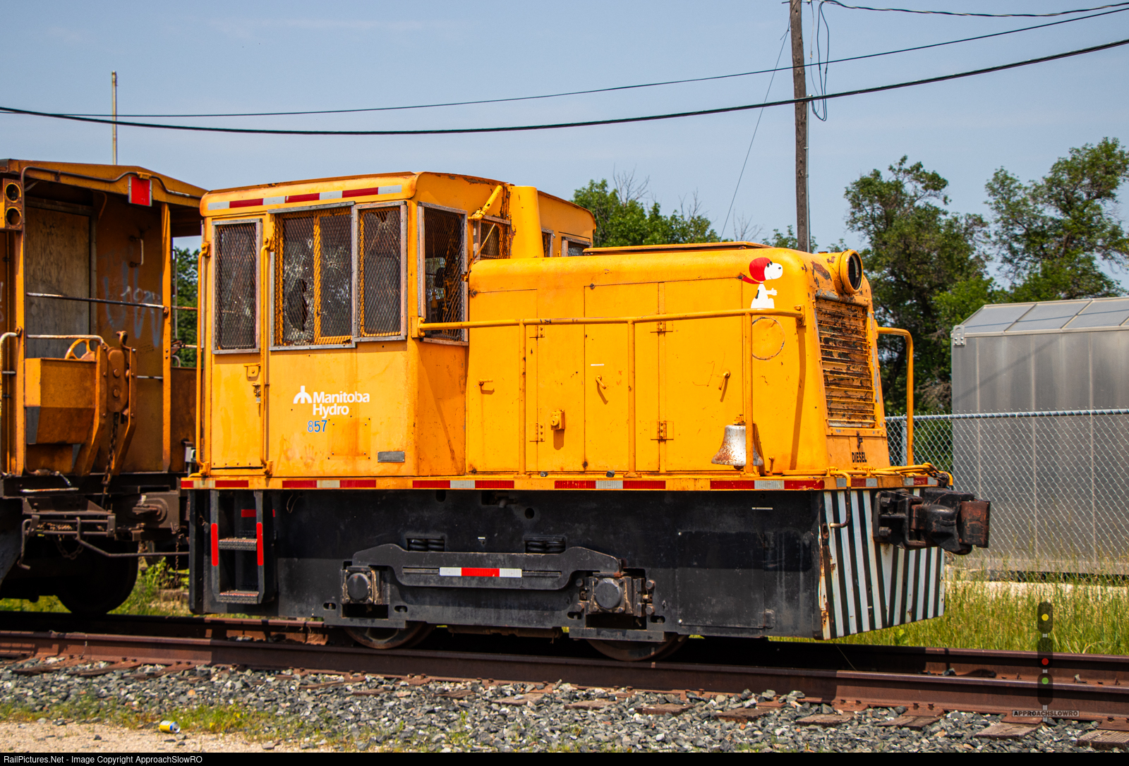 Former Manitoba Hydro locomotive 857 "Snoopy" sits outside the CP rail station in Portage, coupled up to CP caboose 434560. I'm unsure of the reporting mark so I went with the closest thing I could think of
