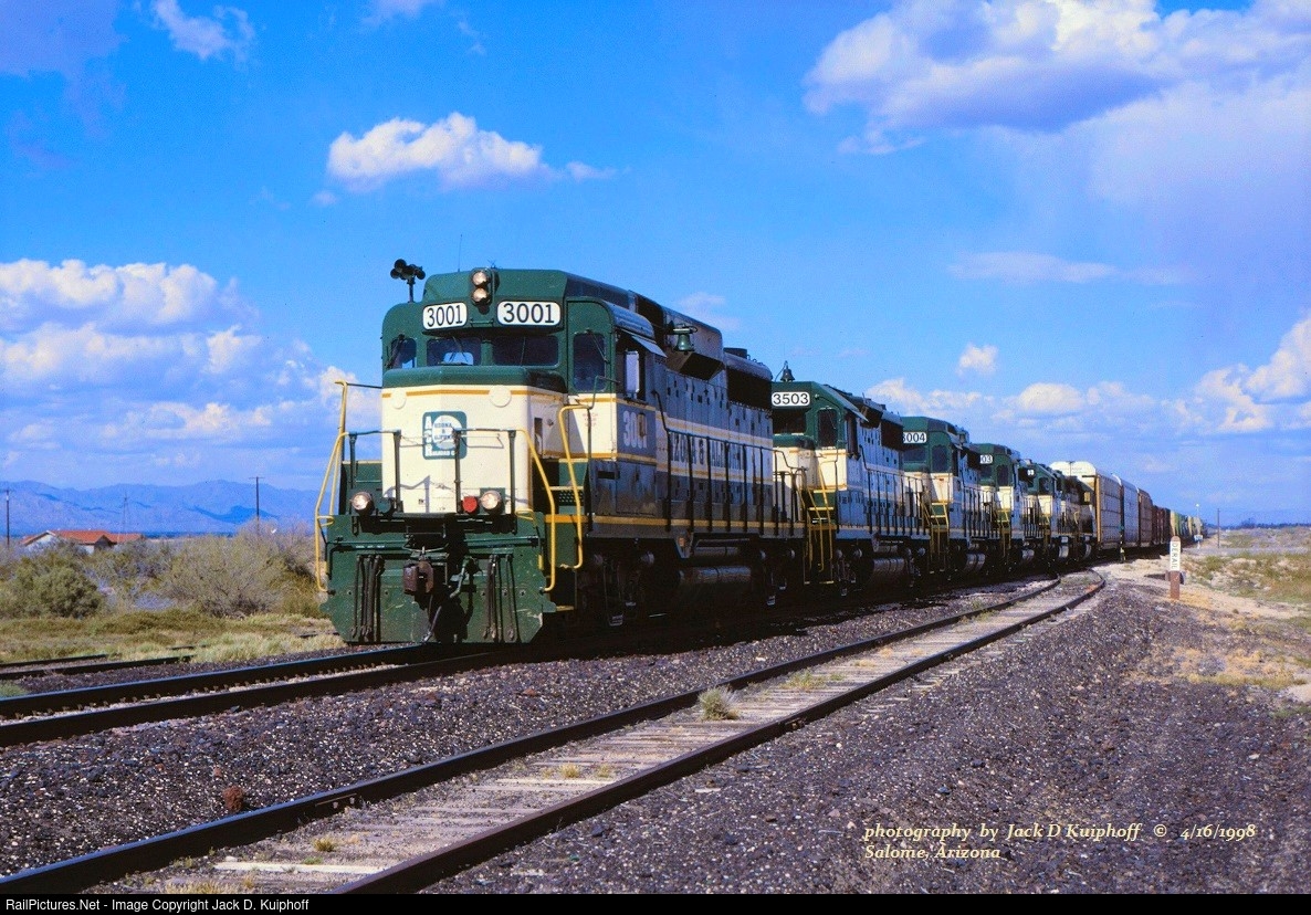 | ARZC, Arizona and California, EMD GP303001 leads westbound 708, on the ex-AT&SF at Salome Arizona. April 16, 1998. Jack D Kuiphoff © |