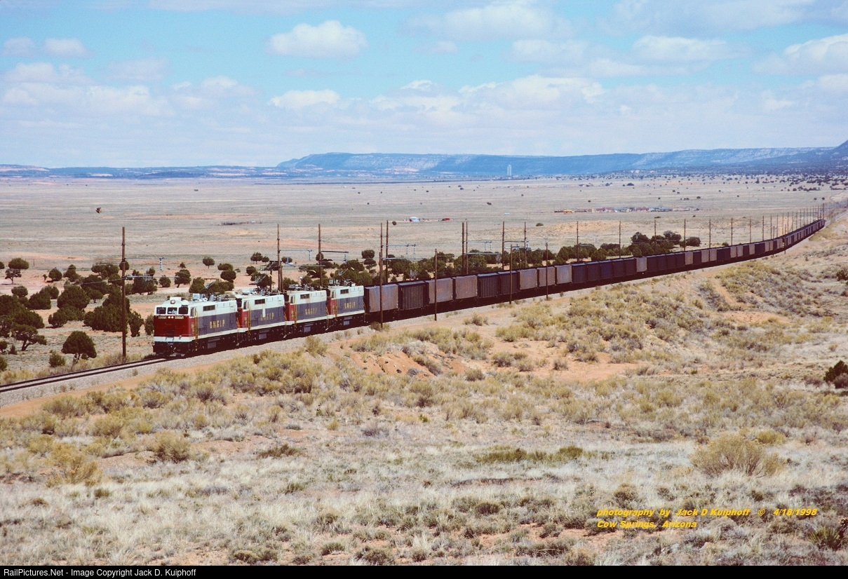 | BM&LP, Black Mesa and Lake Powell, GE E60C's 6005-6006-6003-6002, with a loaded coal train at Cow Springs, Arizona. April 18, 1998. Jack D Kuiphoff photo © |