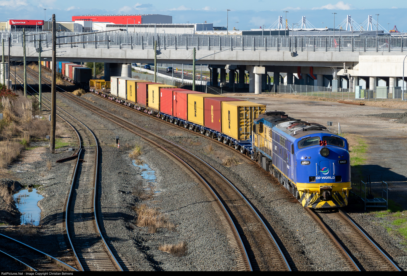 Seen in its new wrap, GM27 leads 4532 into Sydenham with DP World trip train T277 from DP World, Port Botany to the Yennora Distribution Centre. GM27 has been wrapped in a blue/purple livery with contractor DP World displayed on the front of the loco.
