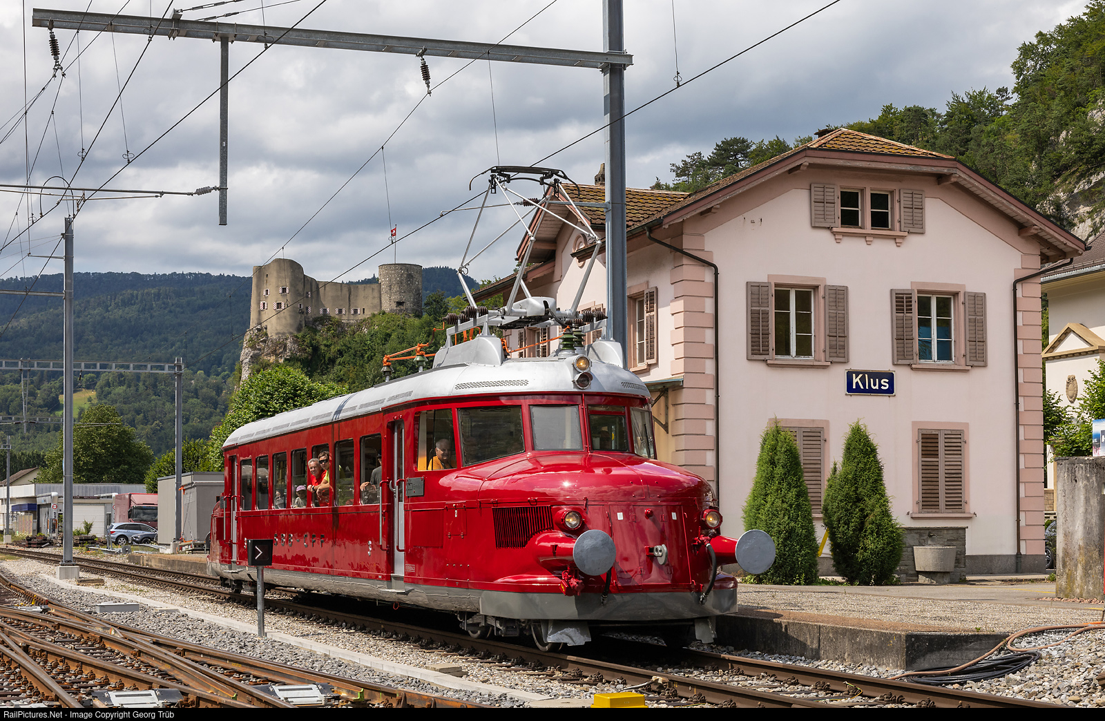 | On the day exactly 125 years after the inauguration of the Oensingen-Balsthal Railway (OeBB), the iconic "Red Arrow" RCe 2/4 # 607 of the OeBB Historic made some public runs for free between Balsthal and Oensingen. Here the train is leaving Klus for Oensingen. In the background Alt-Falkenstein fortress from the 13th century. |