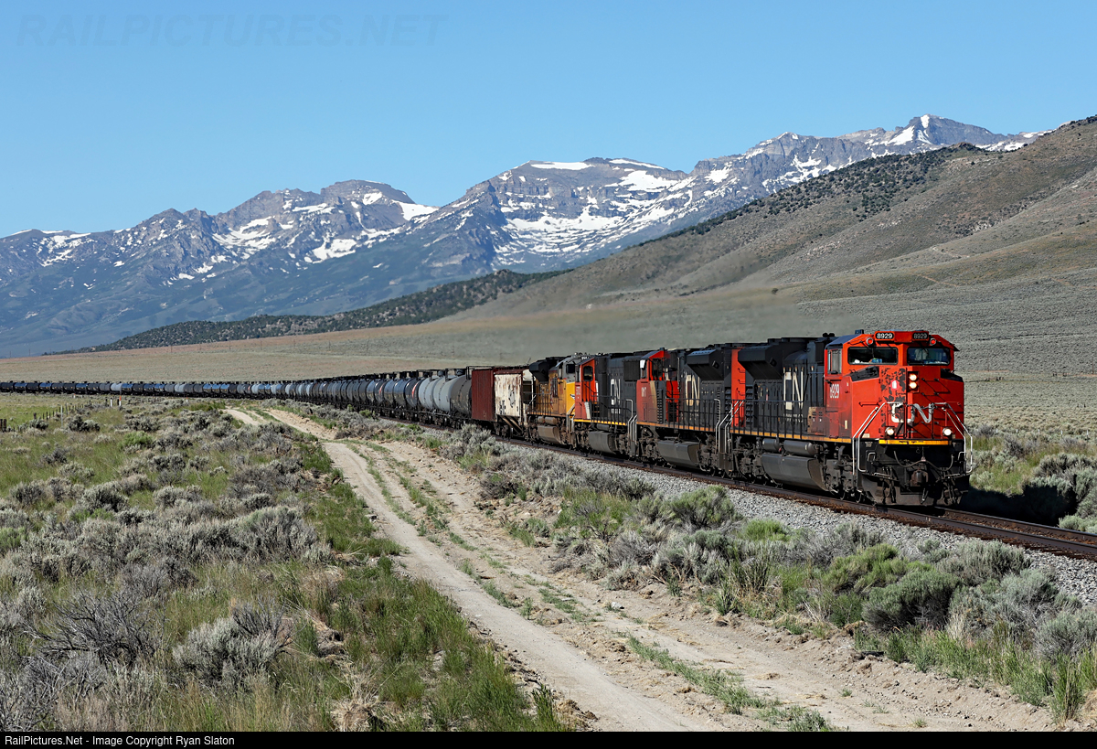 | Westbound between Ruby and Wells, a heavy unit train sails along the former Seventh Subdivision of the Western Pacific as it skirts the Ruby Mountains (which tower over this scene) before joining the paired track mainlines at Alazon. |