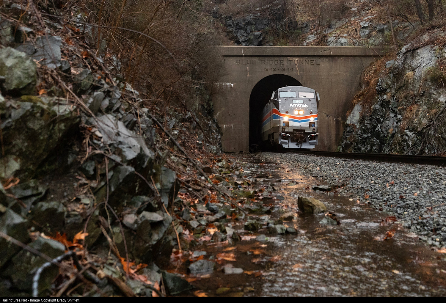 | Amtrak 50, the eastbound Cardinal pops out of the east portal of the Blue Ridge Tunnel on Buckingham Branch Railroad’s North Mountain Subdivision. The train is nearly crawling past me, as just around the corner they will be heading into the hole at West End Afton to meet Amtrak 51, the trains westbound counterpart. |