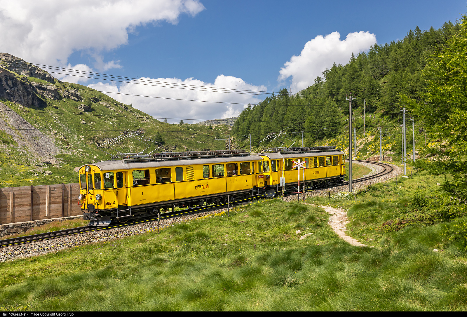 | Bernina Glaciers Adventure train 1639 of the Rhaetian Railway with railcars ABe 4/4 # 30 and # 34 (built 1908/1911 for the then independent Bernina Railway) is above Alp Grüm as train 1639 from Pontresina to Poschiavo. |