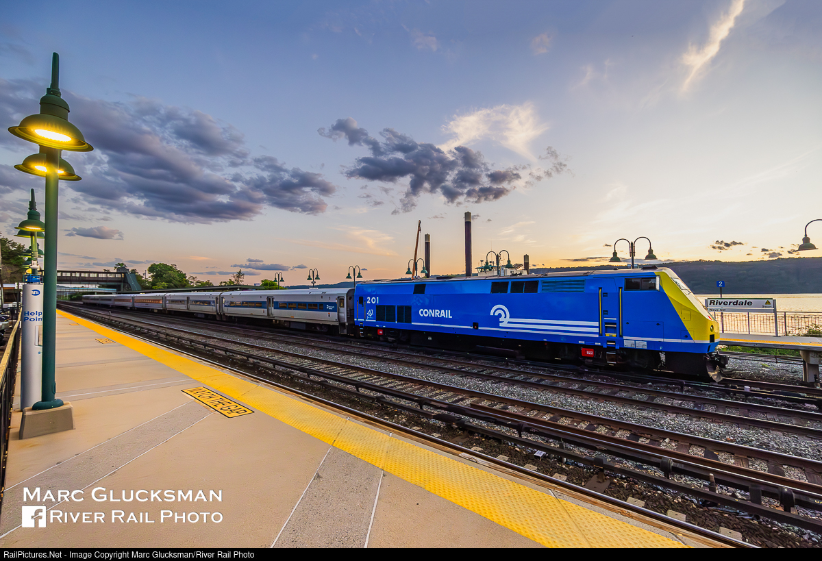 | Closing Out Friday Night. The last train in light of the work week, MNR 886 passes through the MTA Metro-North Railroad Riverdale Station on the way to Grand Central Terminal with P32AC-DM MNCW 201, the 40th Anniversary Conrail/MTA heritage unit, for power. The summer sunset accents the yellow nose of this vintage paint scheme. |