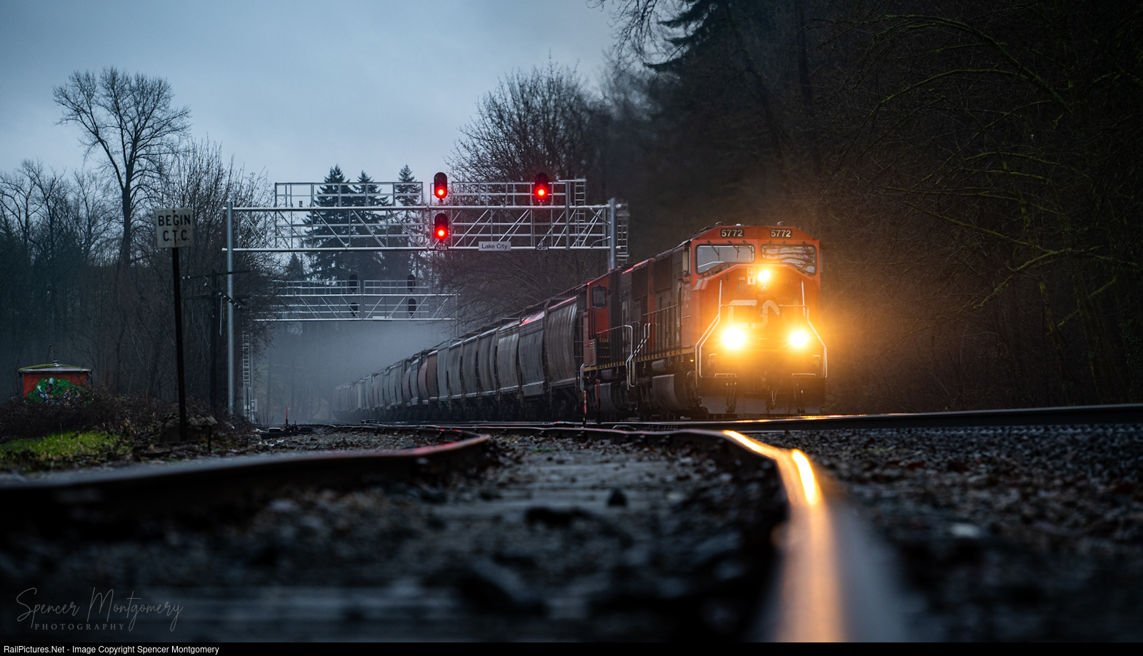 CN 5772, leads 851 up hill at Lake City on a cool morning.