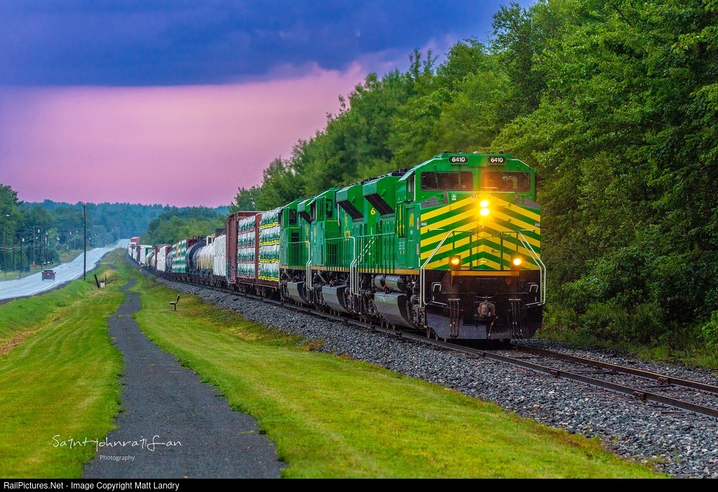 NBSR 121 rumbles through Tracy, New Brunswick. After the skies opened up with thundershowers, the sunset came through again, creating some interesting skies. The downpours can still be seen at the left of the photo.