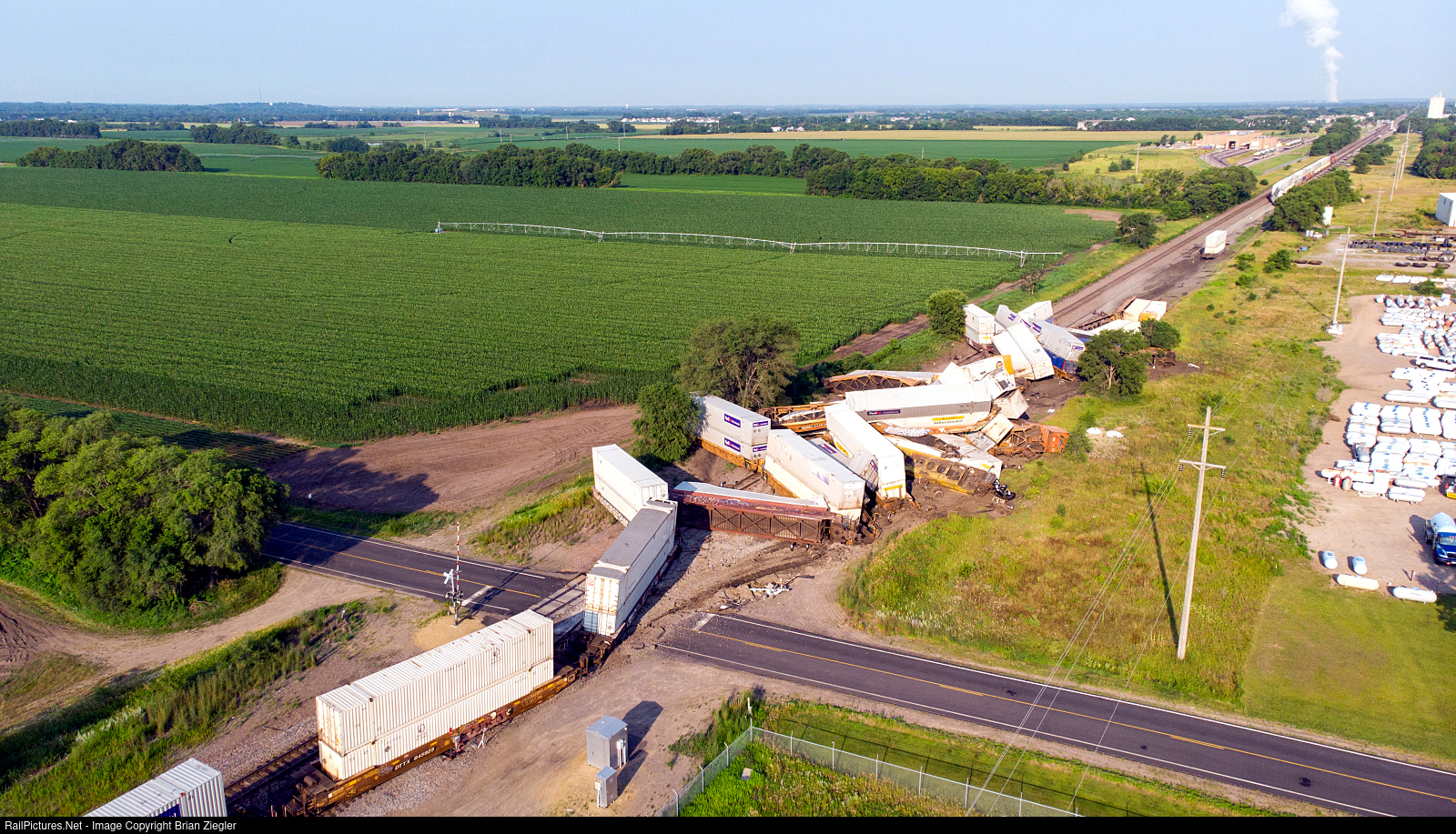 | Z Chicago-Portland train derailed at 172nd St NW east of Big Lake MN. Not sure if the switch for Midwest Lumber, across from the signal bungalow, was the culprit or not. Approximately 15 cars derailed. Northstar's commuter rail facility is at the upper right. |