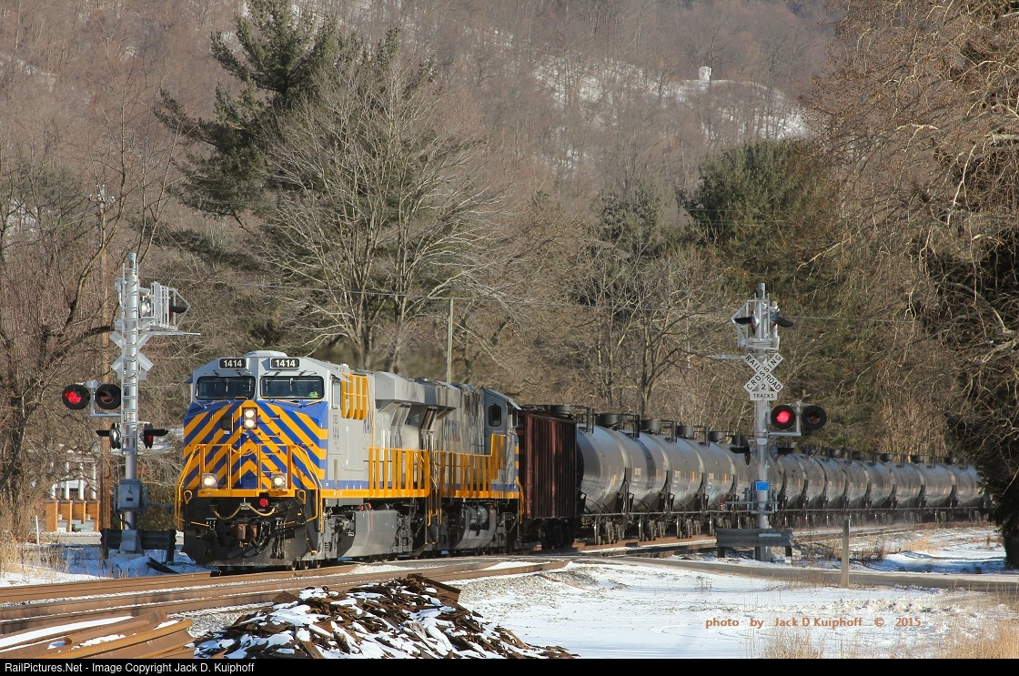| CREX 1414 1312 with west bound CSX K045, at BF286 CSX Pittsburgh sub, Layton, Pennsylvania. January 10, 2015. Jack D Kuiphoff © photo |