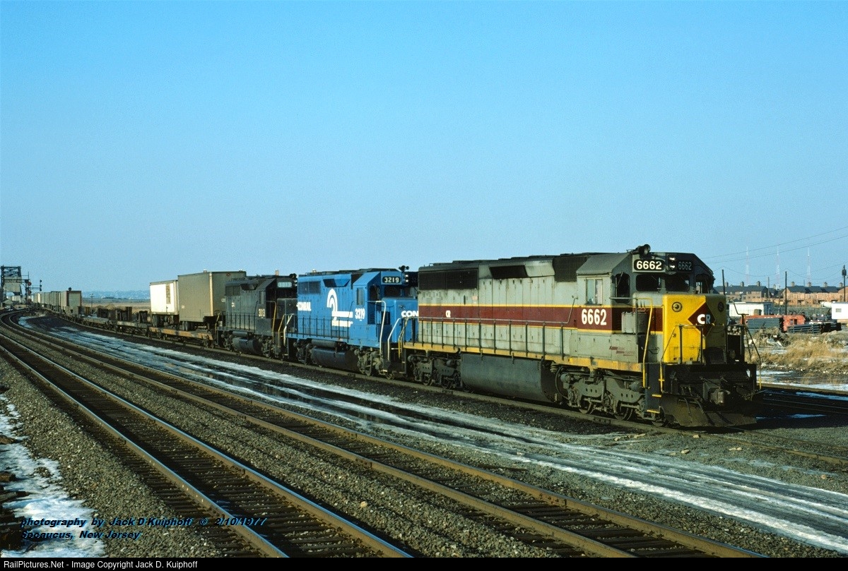| CR, Conrail SD45-2 6662 ex-EL 3677-CR GP40 3219 ex-PC- CR GP40 3013 ex-NYC, is nearing the end of its eastbound trip with TV98. The train has just crossed the river at HX and is entering the ex-Erie Croxton yard at Secaucus, New Jersey. February 10, 1977. Jack D Kuiphoff © photo |